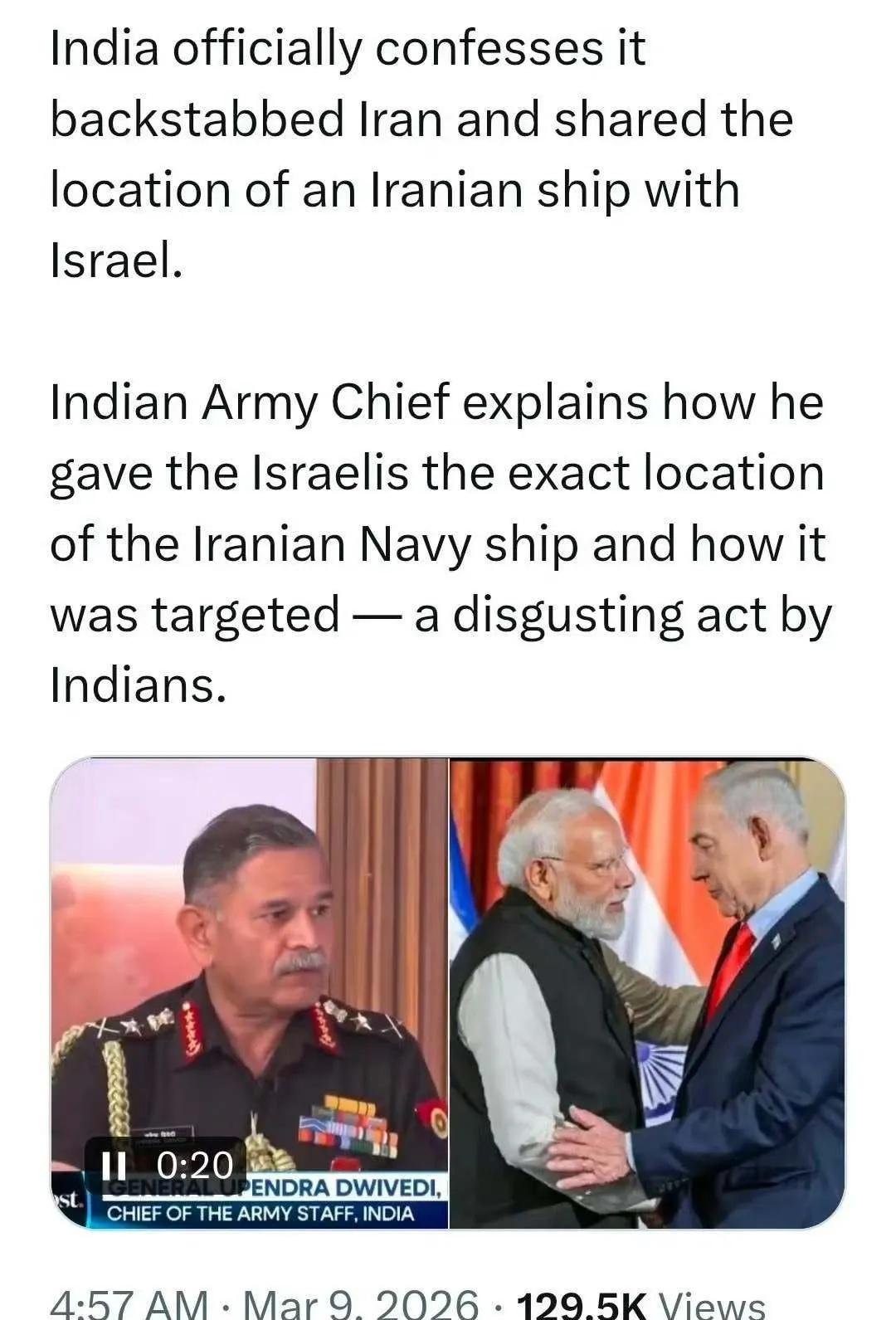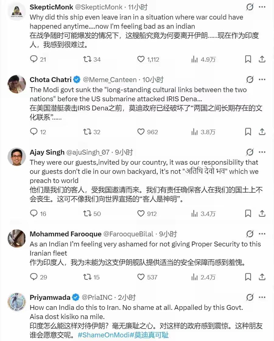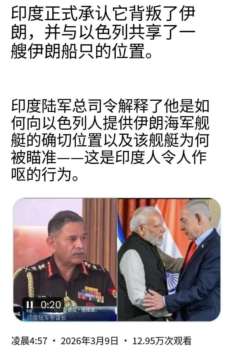 伊朗“德纳”号护卫舰于2月25日应印度军方邀请,在孟加拉湾参加了印度海军主导的军演,3月4日返航回国途中遭美军伏击沉没,造成104人死亡、32人受伤。 消息传来,印度网友一片哗然,纷纷谴责印度政府,一网友评论称:印度怎么这样对待伊朗?毫无廉耻之心,对这样的政府感到震惊。这种朋友谁还愿意交呢? 现在印度彻底不装了,陆军参谋长公开承认:作为以色列的战略伙伴,有责任向以色列提供伊朗海军军舰的确切位置。印度的行为着实令人作呕!有网友评论称,如果说美军无耻,印军更无耻!