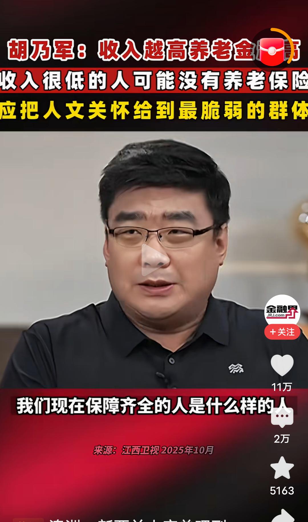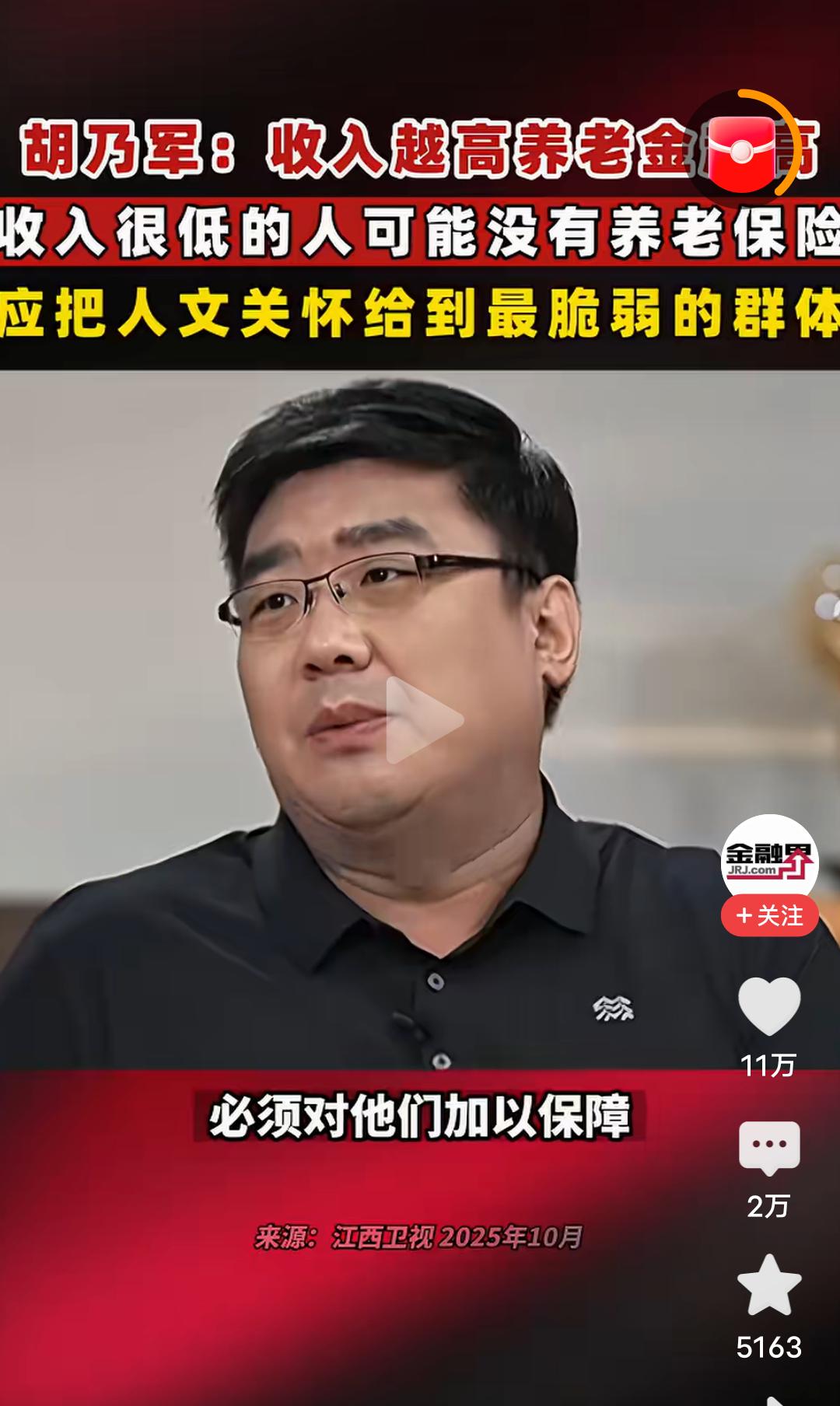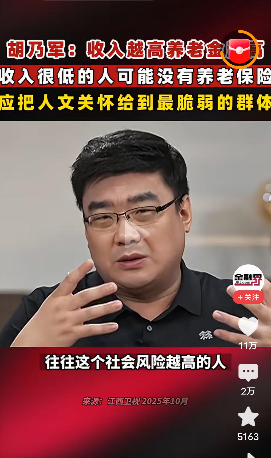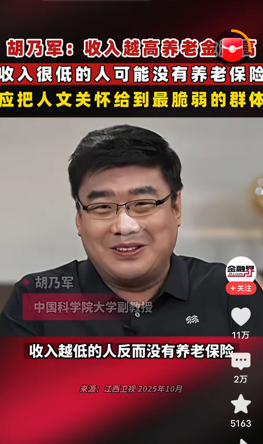 灵魂拷问!这才是真正的良心专家,百姓拥戴的专家! 中国科学院大学副教授胡乃军说,在中国,有个奇怪的现象,就是收入越高的人养老金越高,收入越低的人反而没有养老保险,那么我们保障齐全的人到底是什么人?我们的保障体系到底是为谁服务的?? 工作稳定,收入高的人群,本身发生风险的概率就很低,可是风险越低的人,保障越好。 而风险越高的人,他们才是最脆弱的人,因为一旦发生风险,对他们生活的冲击力是很大的。所以他们才更应该享受更高的保障! 说的太好了,终于有人说句实话了!这是事实,穷人越穷,富人越富!富人越富,福利越好,多么可笑的社会! 有网友说,这可以成为21世纪最经典的一句话:那就是收入越高的人,养老金越高,工资越低的人养老金就越这低,这是21世纪最讽刺的事情。 在新西兰,澳大利亚,加拿大等文ming国家,所有人退休以后的待遇是一样的,从总理到扫地工,退休后享受一样的待遇! 应该改革养老金制度,工作时,按岗位不同,收入高低不同,退休后全部一律平等! 老铁们,你们觉得这样可行吗?阻力在哪里???