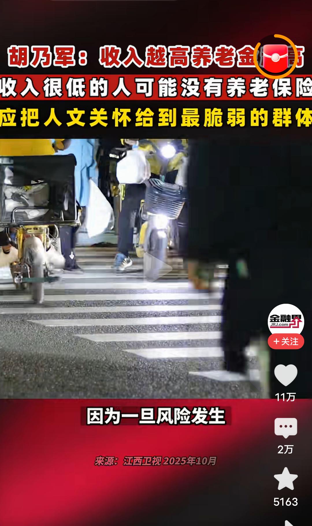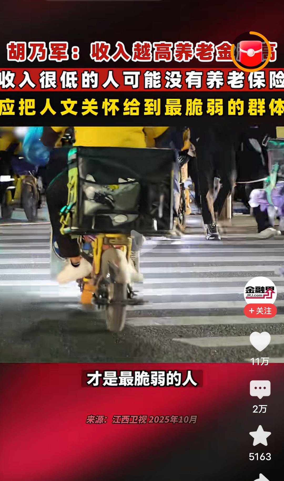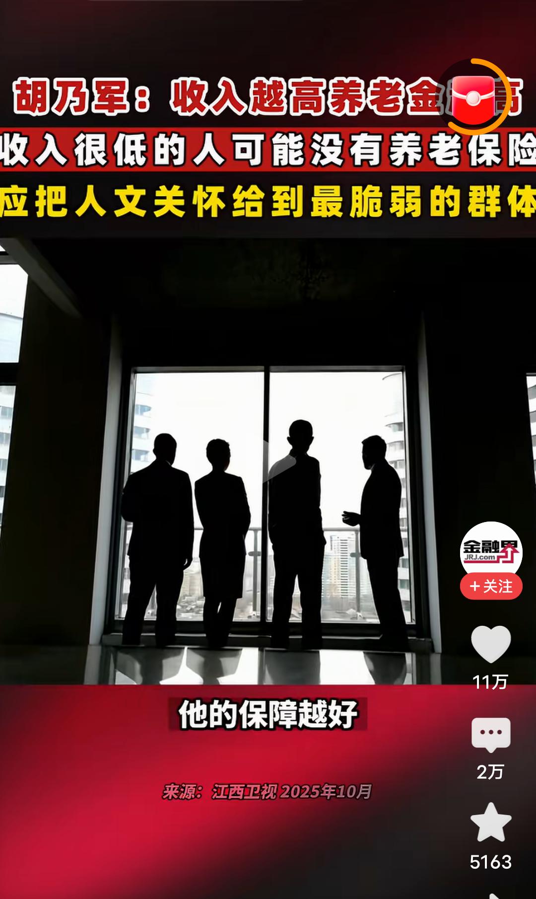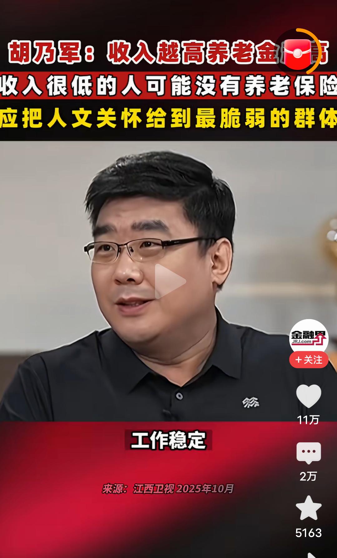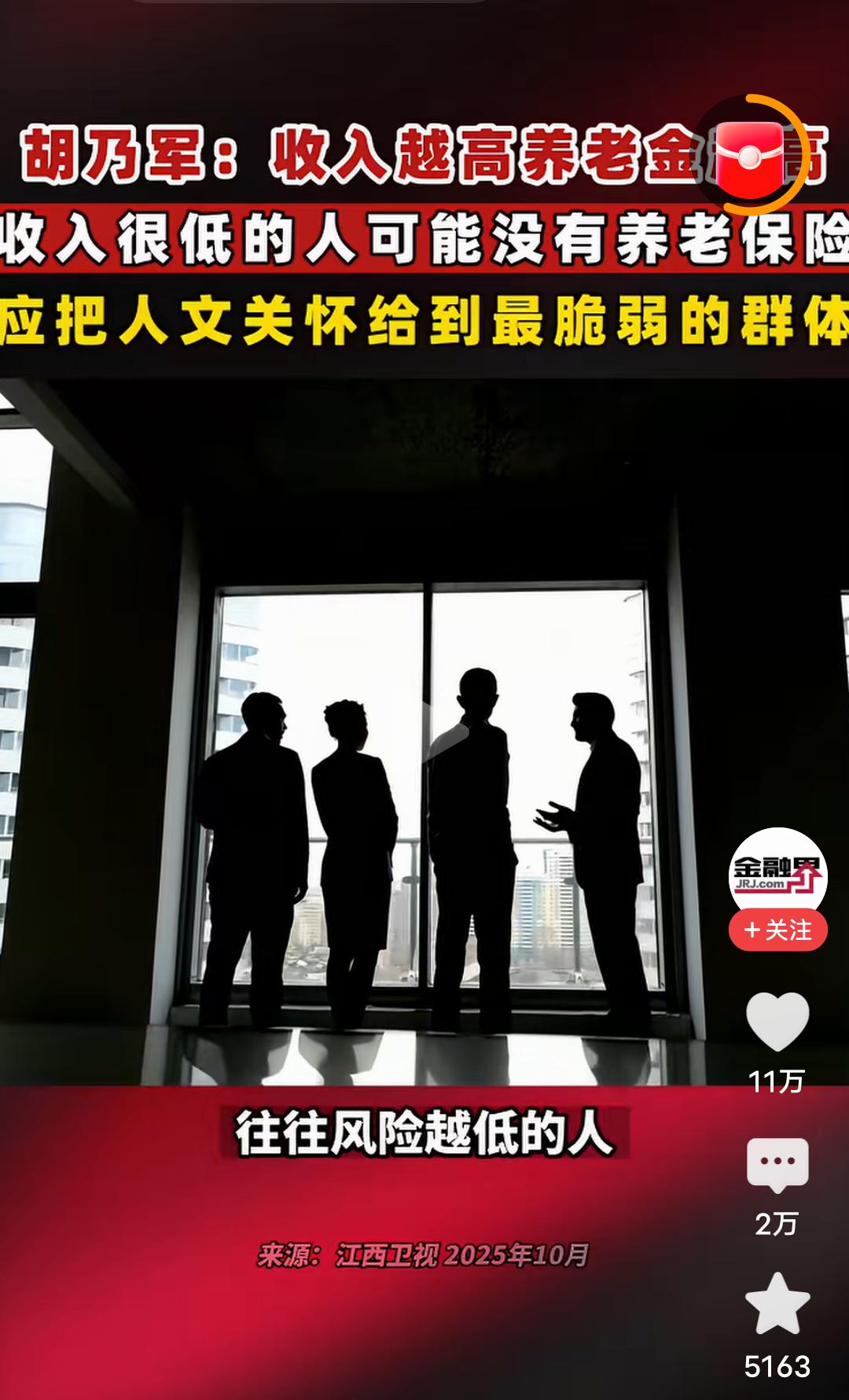 灵魂拷问!这才是真正的良心专家,百姓拥戴的专家! 中国科学院大学副教授胡乃军说,在中国,有个奇怪的现象,就是收入越高的人养老金越高,收入越低的人反而没有养老保险,那么我们保障齐全的人到底是什么人?我们的保障体系到底是为谁服务的?? 工作稳定,收入高的人群,本身发生风险的概率就很低,可是风险越低的人,保障越好。 而风险越高的人,他们才是最脆弱的人,因为一旦发生风险,对他们生活的冲击力是很大的。所以他们才更应该享受更高的保障! 说的太好了,终于有人说句实话了!这是事实,穷人越穷,富人越富!富人越富,福利越好,多么可笑的社会! 有网友说,这可以成为21世纪最经典的一句话:那就是收入越高的人,养老金越高,工资越低的人养老金就越这低,这是21世纪最讽刺的事情。 在新西兰,澳大利亚,加拿大等文ming国家,所有人退休以后的待遇是一样的,从总理到扫地工,退休后享受一样的待遇! 应该改革养老金制度,工作时,按岗位不同,收入高低不同,退休后全部一律平等! 老铁们,你们觉得这样可行吗?阻力在哪里???