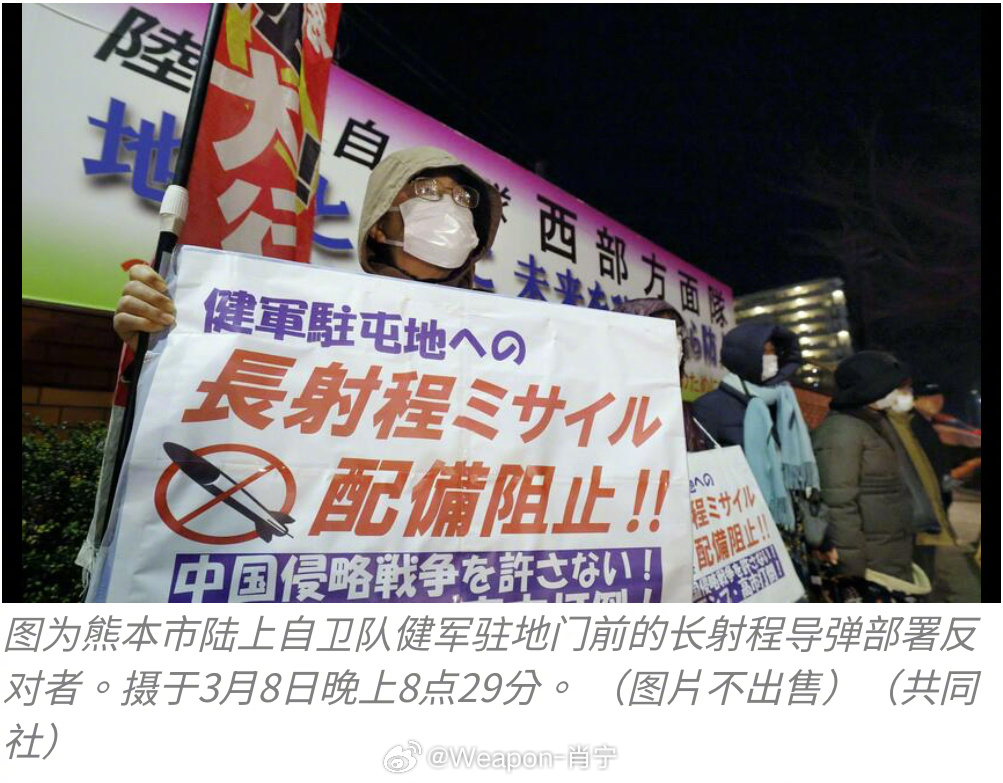 烽火问鼎计划每天认识一件兵器 日本陆上自卫队向位于北九州熊本市的健军准囤地运入12式岸舰导弹。因为害怕反对部署的抗议团体阻拦,此次部署的车队偷偷于深夜从后门进入。此次部署似乎不可告人,NHK本来发布了新闻,但后来悄悄把链接给删了。日本陆上自卫队9日凌晨把被定位为“反击能力”(对敌基地攻击能力)的长射程导弹发射设备等运入首个部署地、熊本市的健军驻地。据相关人士透露,月内将完成部署工作。仅在遭受武力攻击时行使必要最小限度防卫力的“专守防卫”这一战后日本迄今宣导的安全保障政策迎来重大转折。此次部署的导弹是12式陆基反舰导弹性能提升型,射程约1000公里,从九州发射,可以抵达中国大陆沿海地区。日本政府表示一旦认定敌方已着手攻击,那么在尚未遭受损害前就可以发射。如果判断失误,则存在成为国际法禁止的“先发制人攻击”的风险。现场有市民等约100人聚集在驻地正门前,高举写有“反对长射程导弹部署熊本”,“不要让熊本沦为战场”的标语牌进行抗议。有关将导弹搬运至驻地一事,防卫省并未向当地作出说明,抗议活动的参加者强调称:“这是突袭般的暴行。”看看健军驻囤地周边,有超市,有医院,还有大量的民居。熊本县知事木村敬就自卫队在未事先联络的情况下搬运导弹一事向媒体表示:“防卫省称出于部队调配的考虑,无法作出回答。感到非常遗憾。”发射设备等从开发实验部队的据点、静冈县的富士驻地开始运输,在北九州市的新门司港搬运上岸。对于防卫省未就部署导弹召开居民说明会就进行部署的做法,熊本当地的批评声音日益高涨。对敌基地攻击能力被写入2022年的安全保障相关三文件中。 12式性能提升型最初计画2027年3月开始部署,但实际上提前了一年。看到日本抗议者的担忧,大家可以联系最近美军以攻击所谓伊朗军事基地而炸掉伊朗一所学校,造成100多名伊朗小学生遇难的事件。好多殖人替美国解释伊朗怎么把军事基地设置在学校周边,这事只能赖伊朗自己。替健军驻囤地周边的民用目标捏把汗,万一将来出现极端情况,殖人会不会也说,谁让鬼子把军事基地盖在民居附近啊?