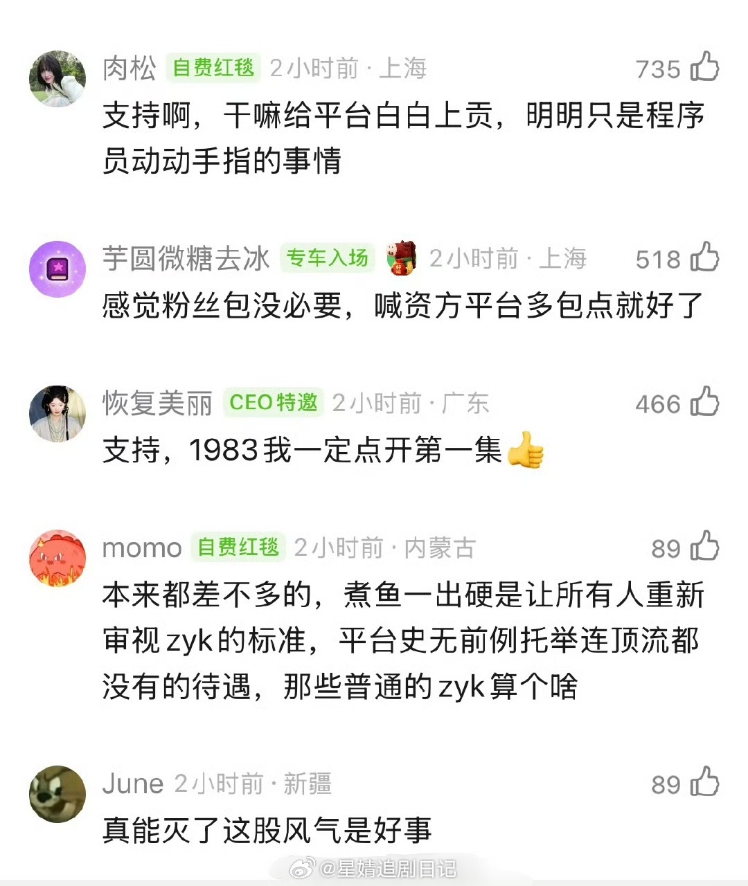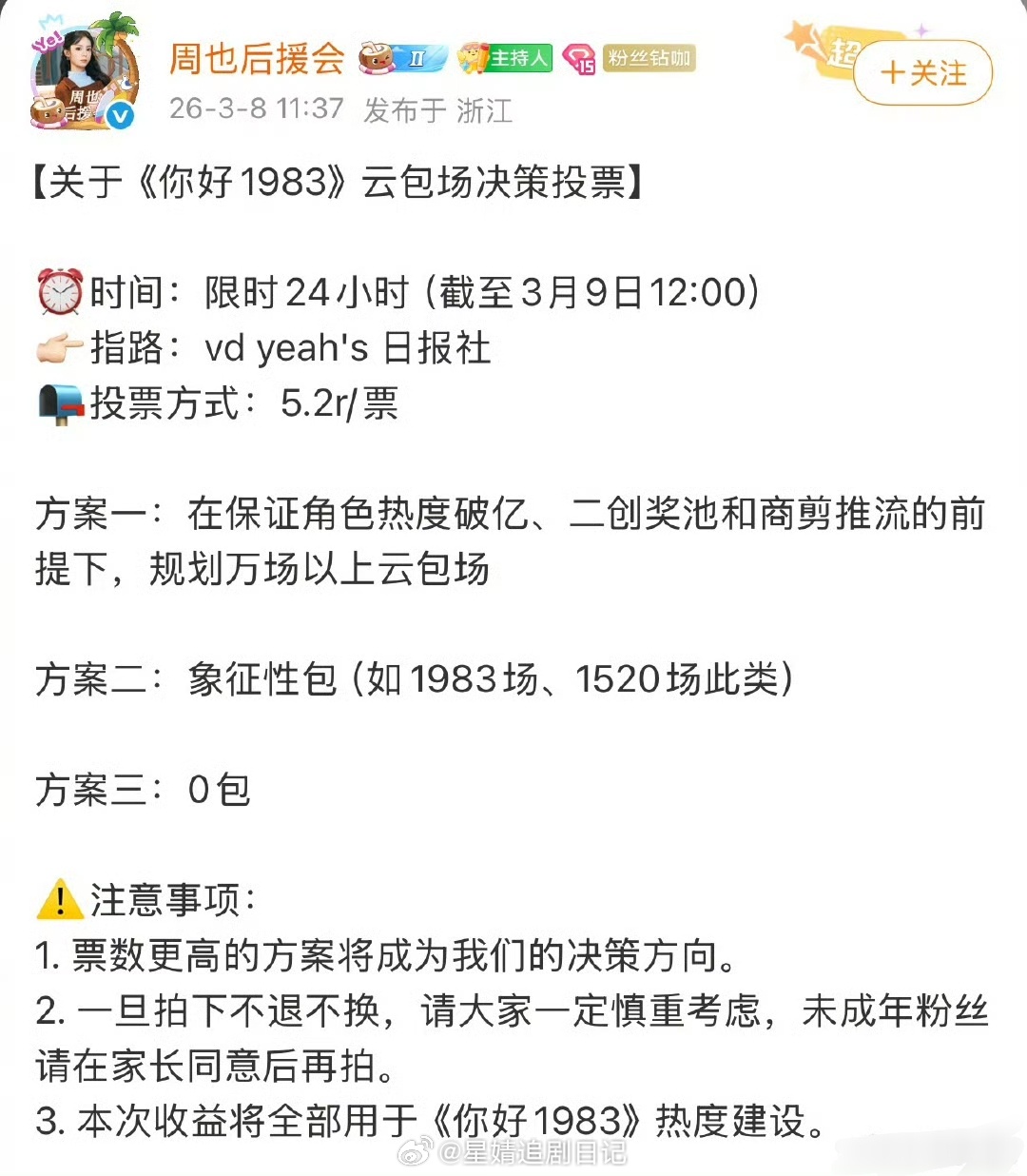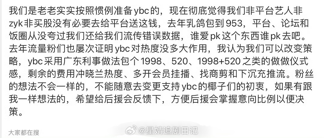 周也后援会清醒,周也后援会 0包场没有🔒gc吧?我试试!经过我的试验,确实🔒了。实话实说周也家其实没有这么大的能量撬动内娱去云包场化,只能说尊重自家选择。这两天一直挂上热搜不过是因为内娱粉圈苦云包场久矣,深刻共情外加观望其他家,只要大家都不包拿自己也可以不包了~可见平台还是觉得云包场很重要因为ybc是真金白银,而且说明平台现在真的非常缺钱。云包场这个金额其实和会员收入比起来差很远的,看来蚊子肉也是肉了。好好做剧可以赚的几十亿会员收入被口碑毁了!现在几百万的ybc当作不能放过的肥肉。狂飙挽救🥝的时候大概没想过今日的结局…那太好了,以后各家都别弄云包场了,粉丝的钱也是钱,再也不用卷了,天天拉表这个包的多那个包的少的,就从周也姐姐家开始吧,我相信以后肯定有很多人都感谢的。就怕你们开了这个头没人跟风啊