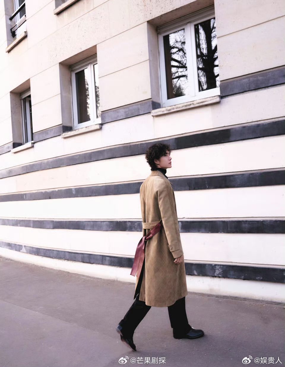 王一博米色菱格纹麂皮大衣王一博街头摄影 王一博米色格纹麂皮大衣和+卷发街拍,好复