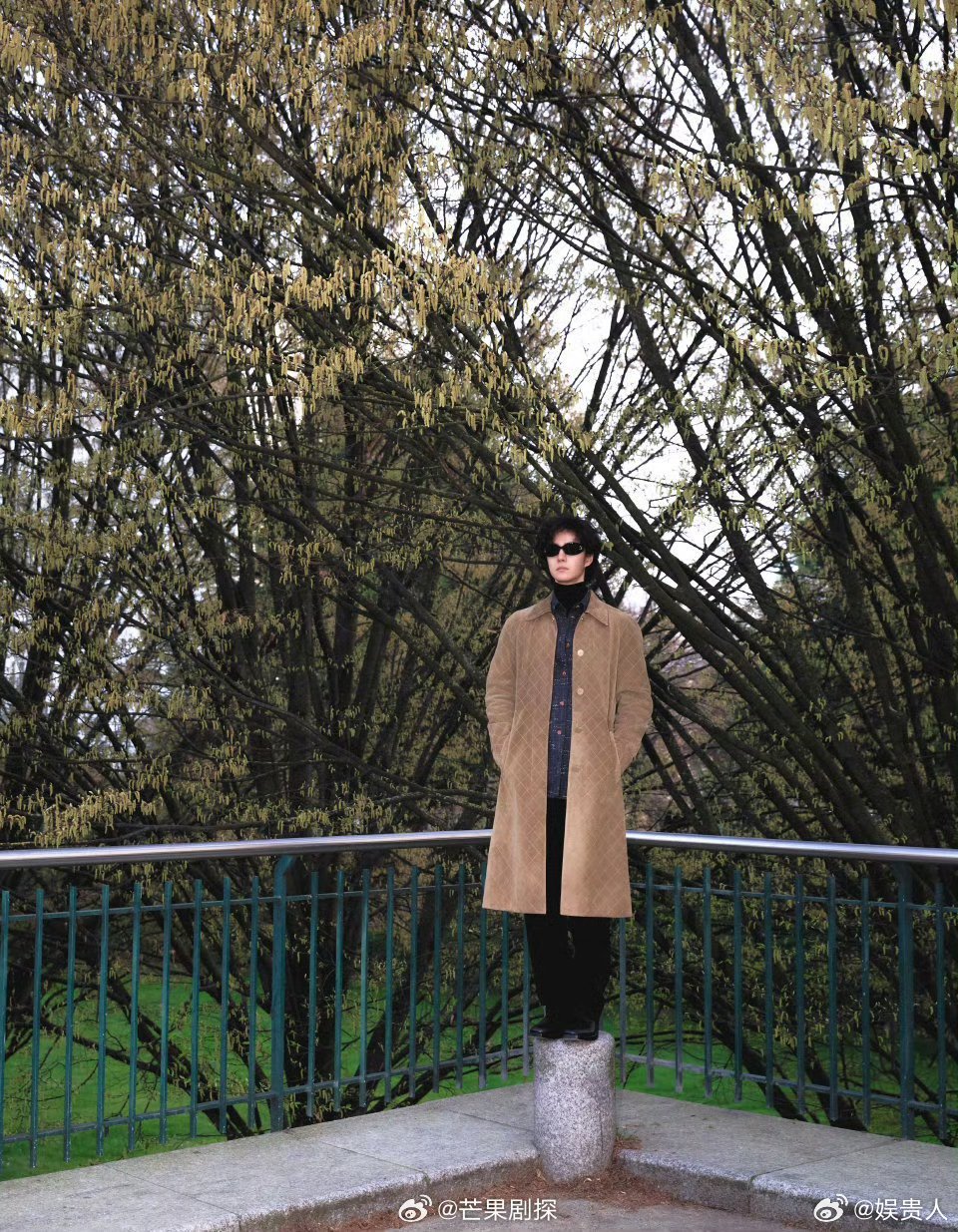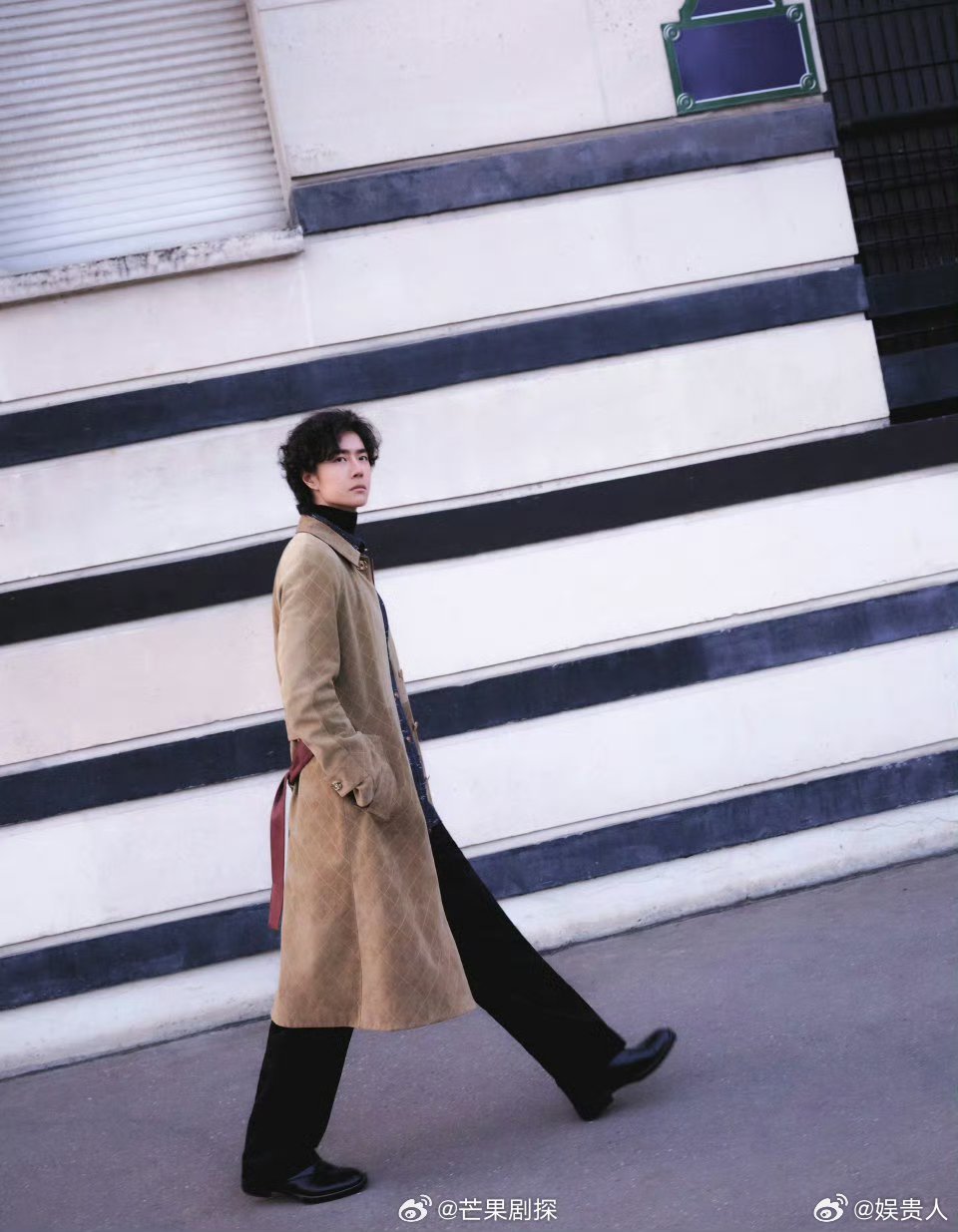 王一博米色菱格纹麂皮大衣王一博街头摄影 王一博米色格纹麂皮大衣和+卷发街拍,好复古,好贵气