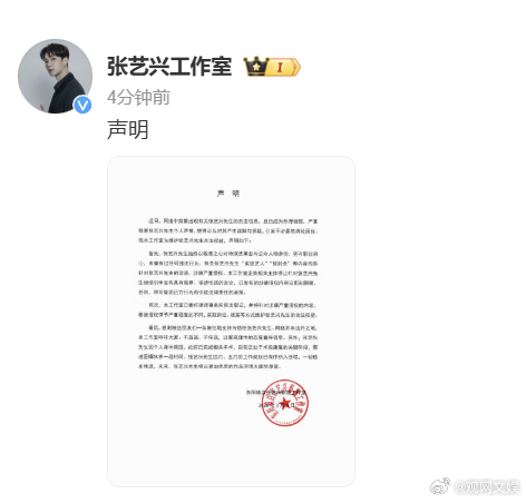 首先,张艺兴先生始终以敬畏之心对待演艺事业与公众人物身份,坚守职业初心,未曾有过任何违法行为。有关张艺兴先生“劣迹艺人”“被封杀”等内容均系针对张艺兴先生的诽谤,涉嫌严重侵权。本工作室正告相关主体停止针对张艺兴先生继续引申发布具有侮辱、诽谤性质的言论,已发布的涉嫌侵权内容应即刻删撤,否则,将可能因己方行为而引致法律责任的承担。