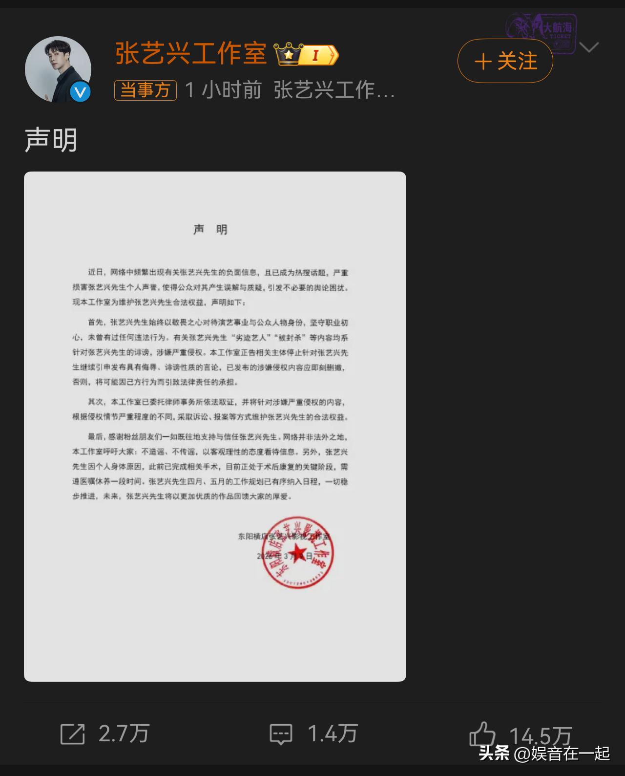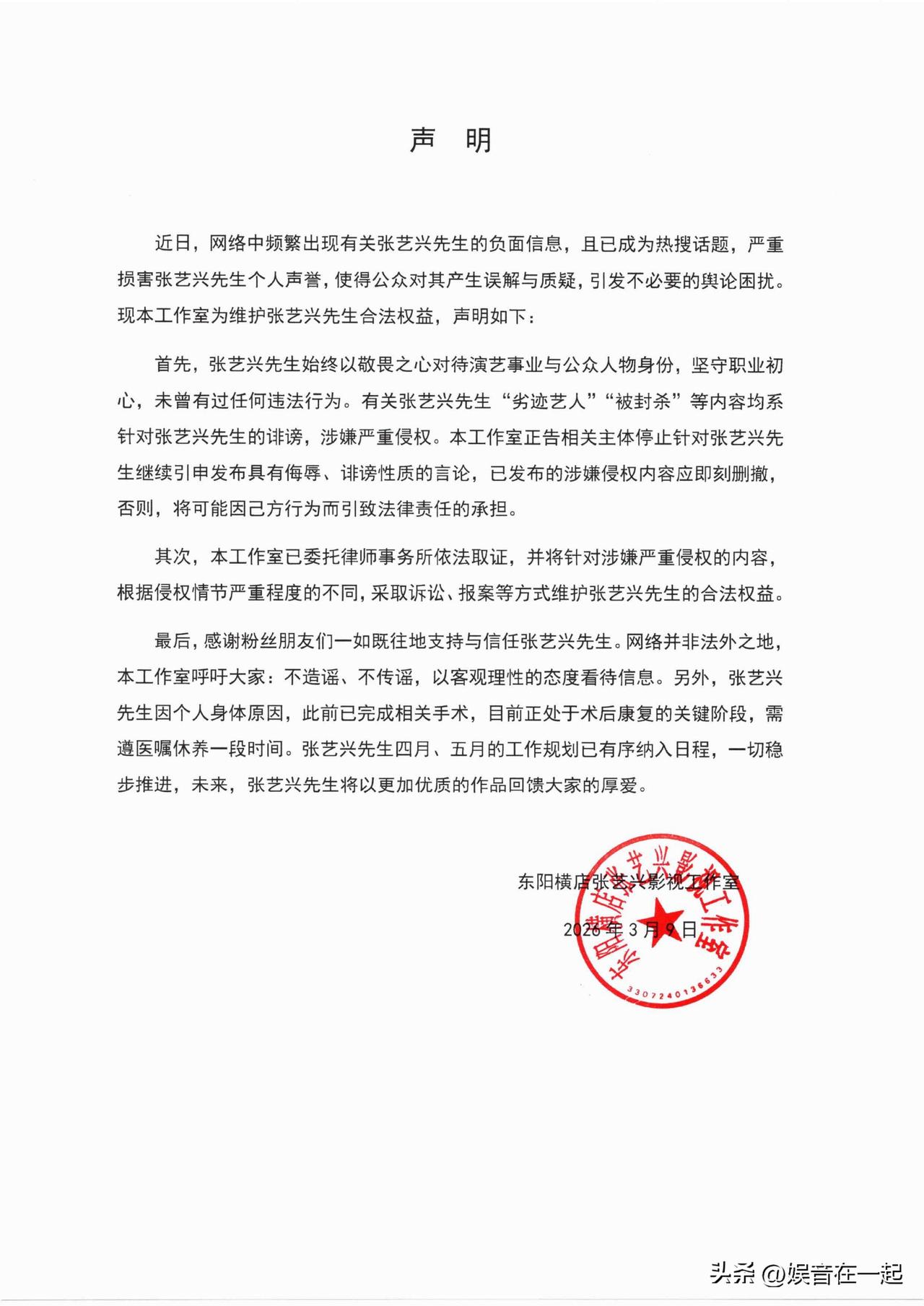张艺兴工作室这次声明真的太绝,堪称业内模板! 3月9日,工作室针对“劣迹艺人”“被封杀”等不实传闻强硬回应。开篇就强调张艺兴坚守初心,无任何违法行为,直接把这些负面内容定性为诽谤,还委托律所取证要维权,零容忍态度太刚了。 之前工作室沉默让传言愈演愈烈,现在发声直接击碎谣言。而且还解释了他“消失”是因术后康复,像之前直播他就说做了鼻炎手术。同时透露四、五月工作规划已有序安排。这声明逻辑清晰、有理有据,给造谣者狠狠一击,张艺兴有这样的工作室太靠谱!