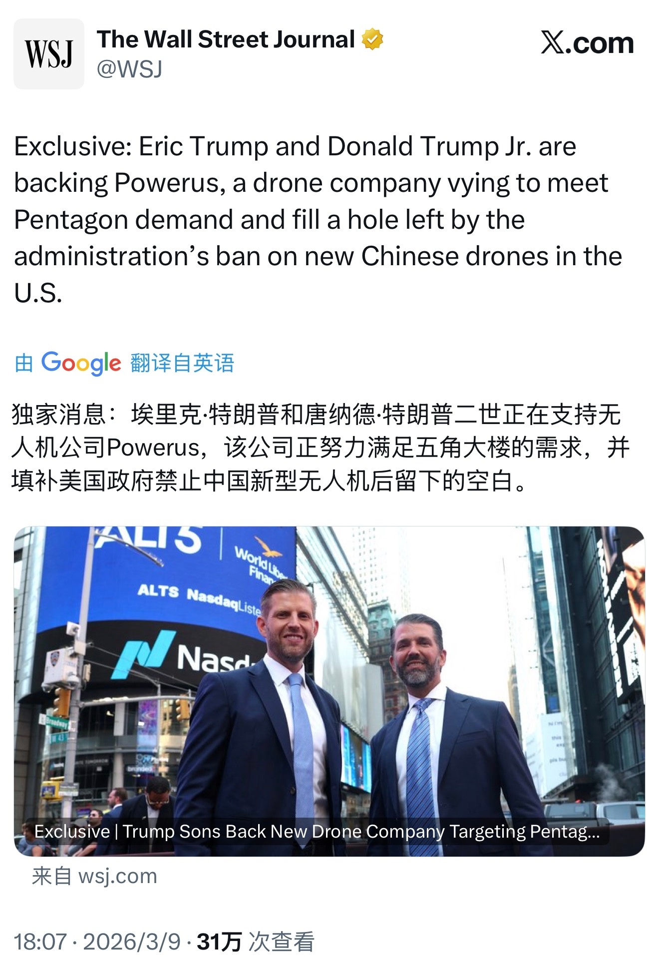 特朗普儿子投资无人机公司——为了儿子们的“这碟醋”,特朗普特意“包了顿饺子”。烽