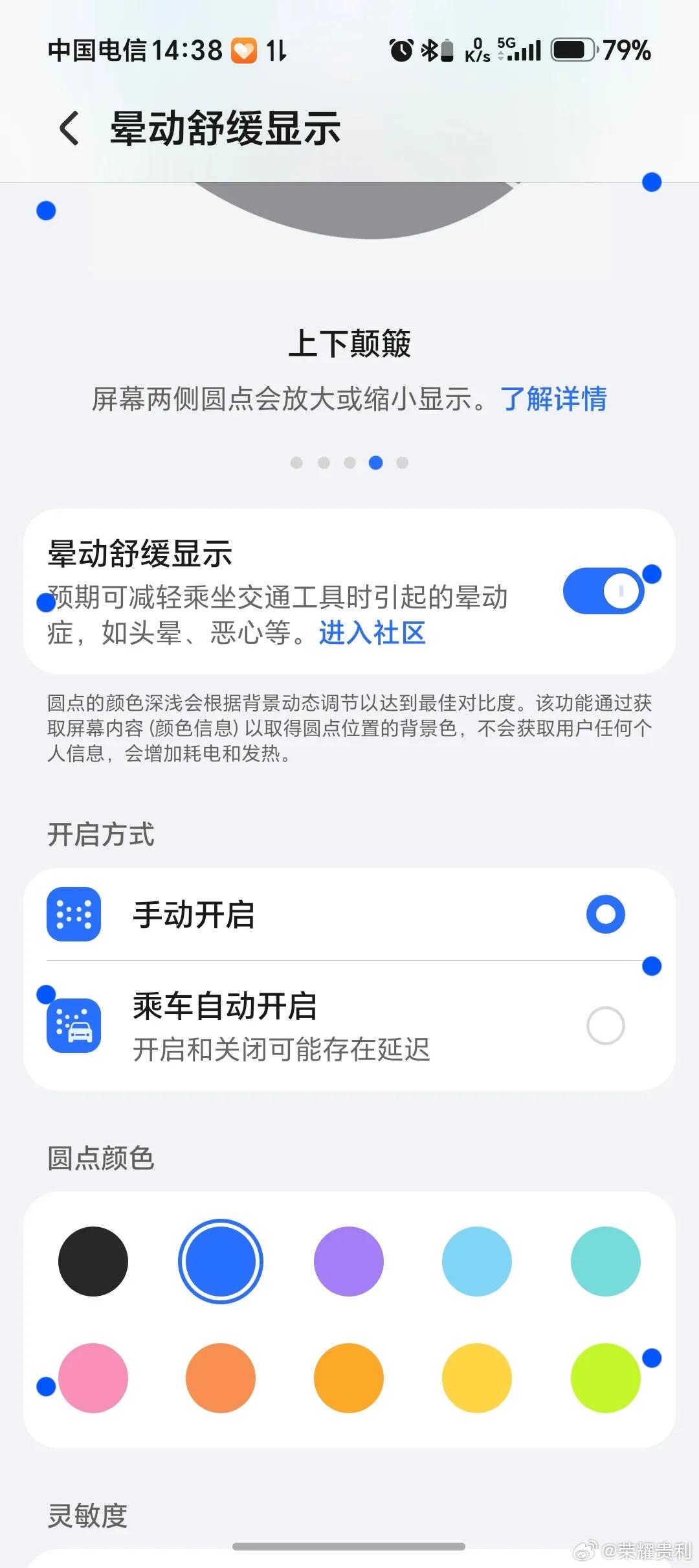 晕车的朋友们请看过来, 平时一从上车的朋友就不是犯晕,除了吃搽能起到防晕,现在有荣耀手机的朋友可以开启防晕车功能,能起到减轻防晕,不知道你们体验过没有? 下面通过一组图文介绍这个功能:在设置中搜索并开启"晕动舒缓显示"后,屏幕两侧会出现随车辆运动而移动的动态圆点,这一功能确实能够有效缓解晕车不适感,对于旅途中的小伙伴来说确实是刚需,不妨试试。 畅聊数码新品 数码资讯