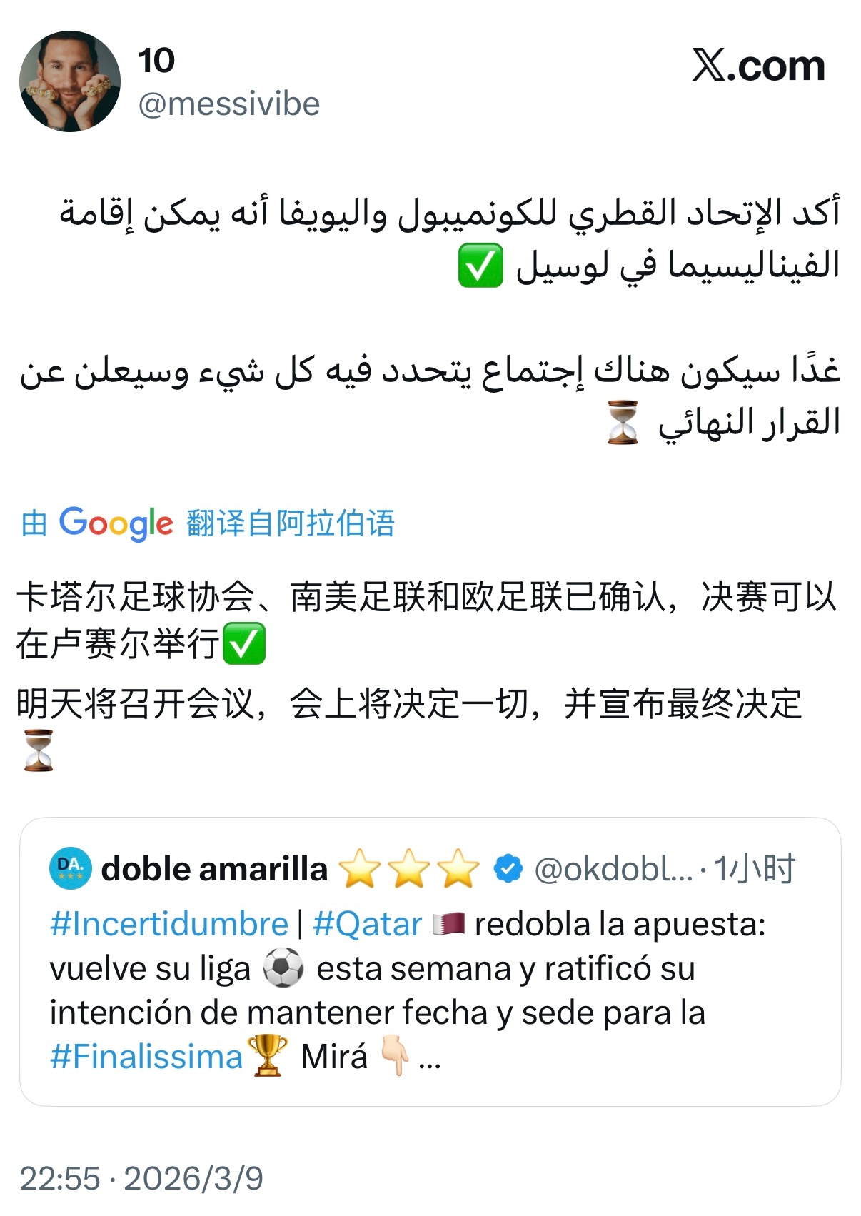 欧足联、南美足联、卡塔尔足协确认决赛在卢赛尔举行。明天将召开会议,敲定所有细节,