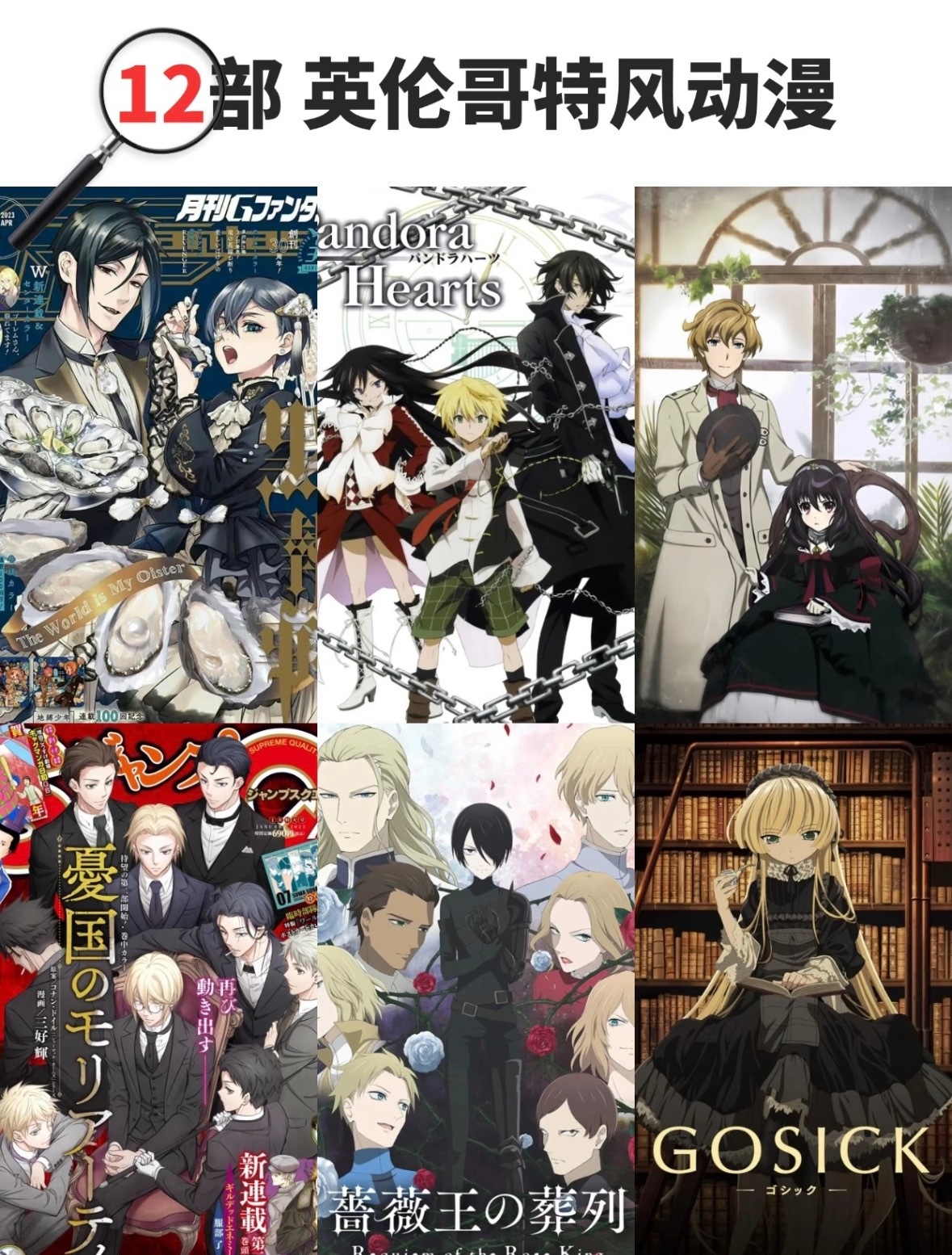 英伦哥特风动漫合集,暗黑控速藏哦!🖤动漫点评团海外动漫名场面日漫 【暗黑契约系】《黑执事》执事美学巅峰《潘多拉之心》怀表深渊绝唱《伯爵与妖精》精灵契约幻想《瓦尼塔斯的手记》诅咒手记狂想【血色浪漫系】《吸血鬼骑士》月下禁忌史诗《蔷薇少女》宿命人偶诗篇《蔷薇王的葬列》玫瑰战争悲歌【迷雾推理系】《GOSICK》金丝笼谜案《忧国的莫里亚蒂》深渊救赎计划《丹特丽安的书架》幻书侦探录【古典权谋系】《王室教师海涅》王室暗面教育《异国迷宫的十字路口》西洋馆秘话每一帧都浸着维多利亚时代的叹息…你最爱哪部颓废浪漫呢?!
