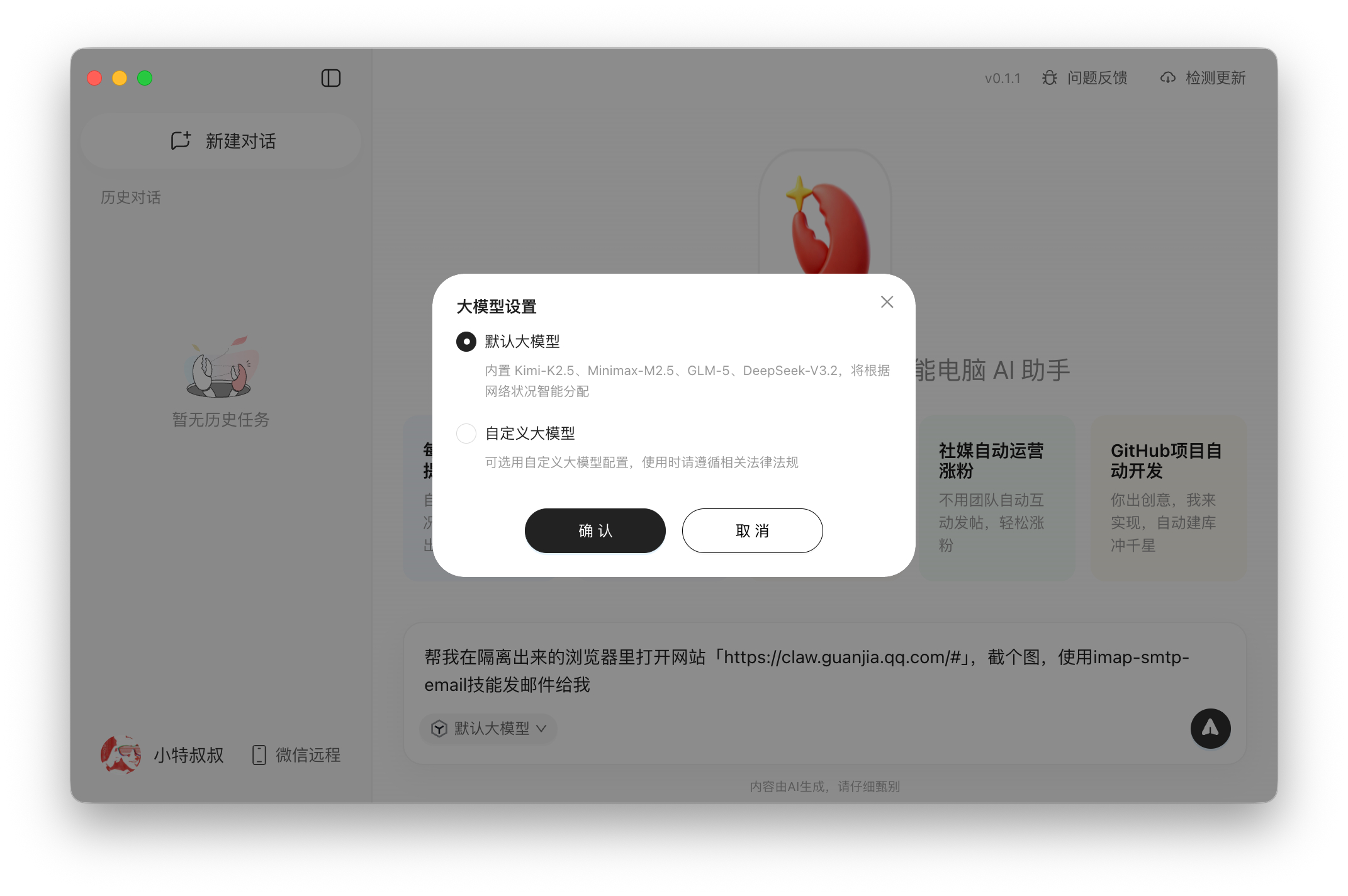 确实是一键安装,操作起来非常简单。直接封装成了大家熟悉的 Chatbot 的样子。默认大模型是 只一个 Kimi、mimimax、GLM 和 Deepseek 混合的模型(元宝呢?可以直接绑定微信,但我没有邀请码。