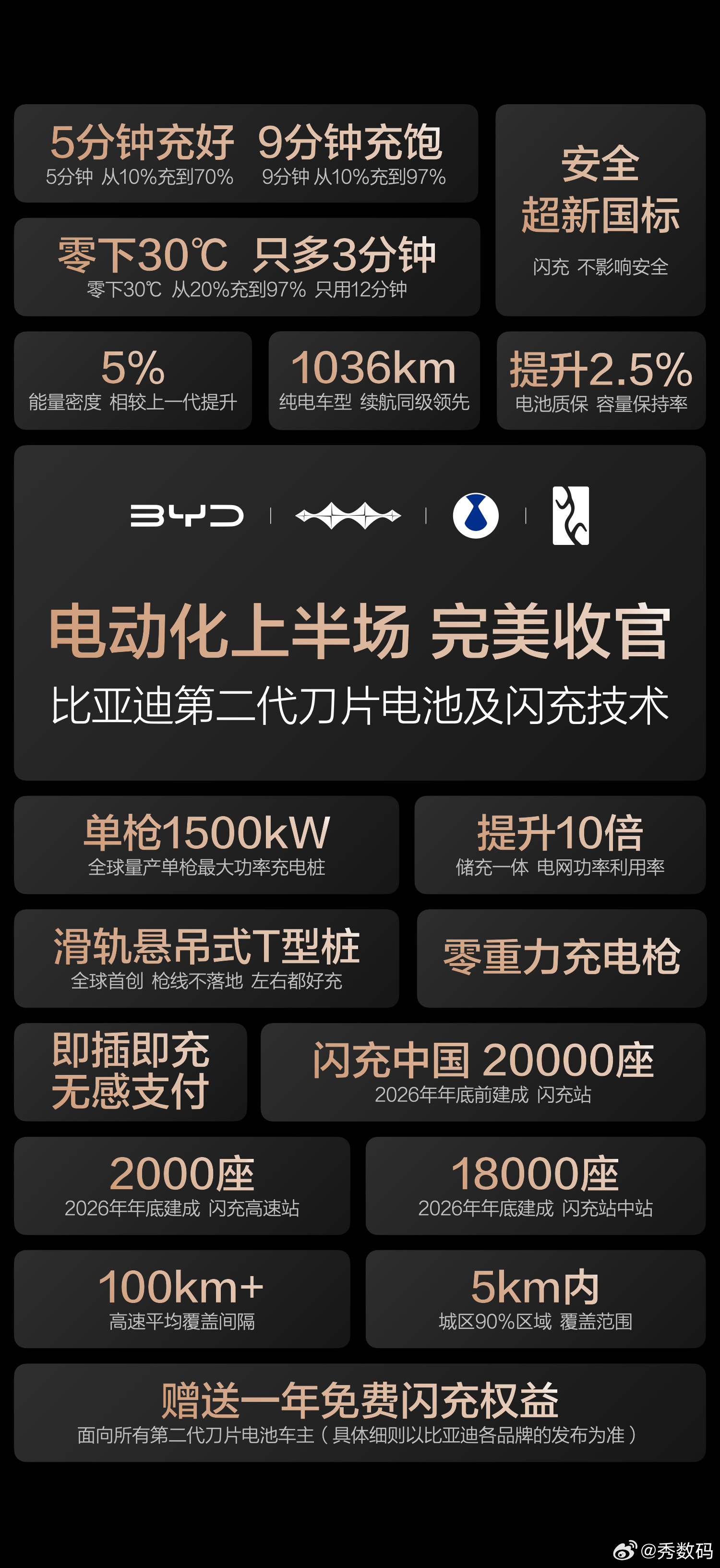 2026年3月5日比亚迪第二代刀片电池重磅发布,硬核闪充技术树立行业新标杆,一举破解充电慢、低温充电难的行业痛点!常温5分钟充好、9分钟充饱,零下30度也仅多3分钟,闪充速度直接拉满。大家担心的闪充伤电池问题,比亚迪也完美解决,靠锂离子高速通道和全温域智能热管理系统,让闪充少产热、快散热,实现闪充与长寿命兼得。质保政策还加码,容量保持率提升2.5%,低于77.5%免费换,电芯终身保修,诚意拉满。安全这块更是卷出新高,500次闪充循环后边充边针刺无热失控,超国标完成4节电芯热扩散、10倍国标底部撞击试验,极端场景下依旧安全。作为电池起家的龙头,比亚迪凭核心技术和全产业链优势,让第二代刀片电池成了动力电池新标杆,也给腾势等多品牌车型装上了硬核“心脏”,这波技术突破真的太顶了!