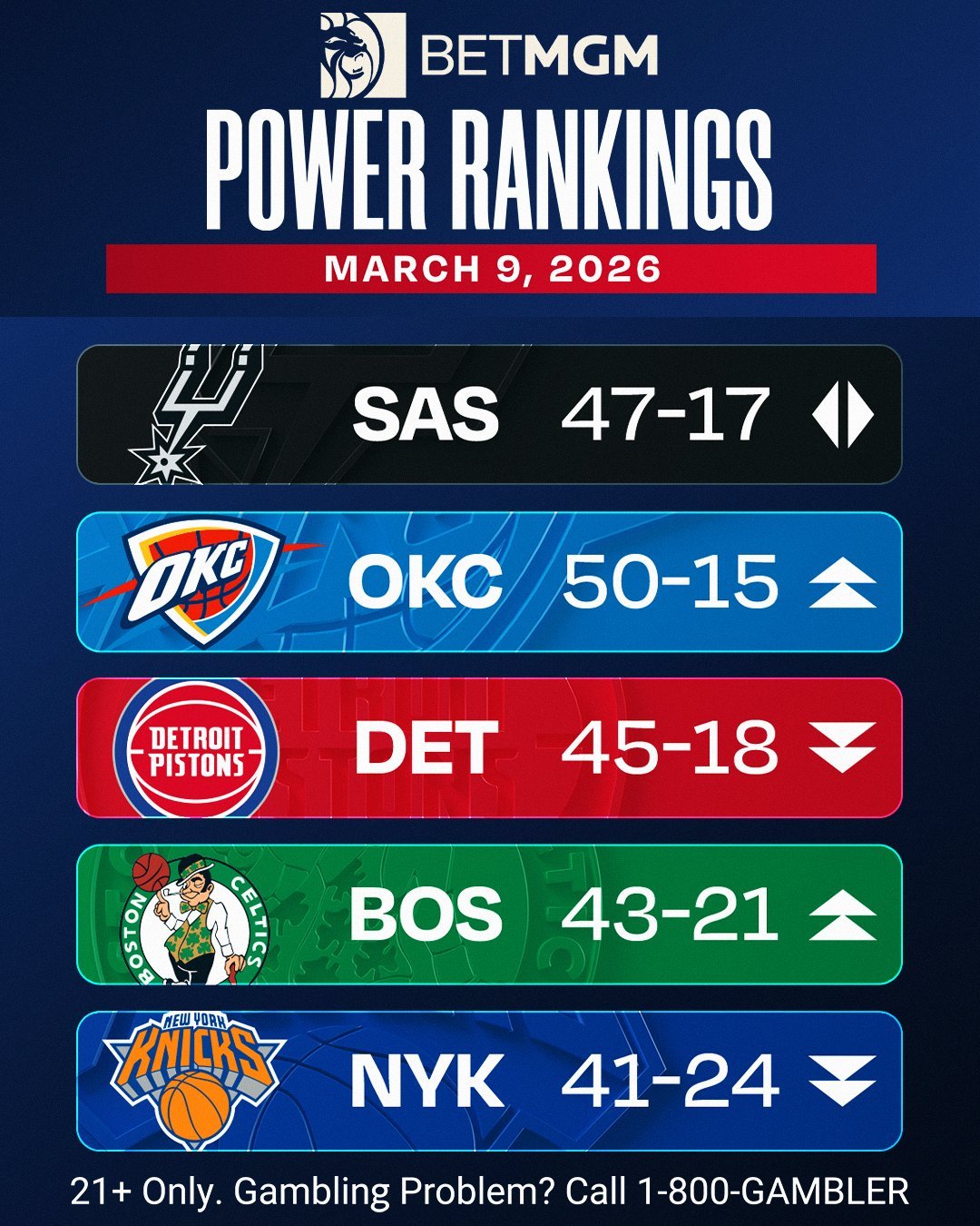 1-10:马刺、雷霆、活塞、凯尔特人、尼克斯、骑士、森林狼、掘金、火箭、湖人