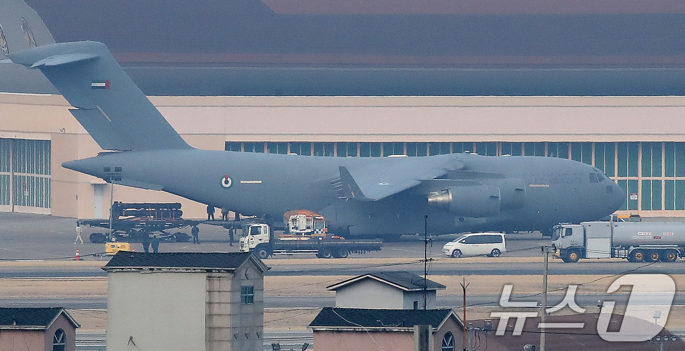 不仅如此,当地时间3月9日,韩国大邱K2空军基地还拍摄到了阿联酋的C-17运输机,正在运输“天弓-2”型中程防空系统拦截弹(如图3),大概要运送30枚拦截弹。