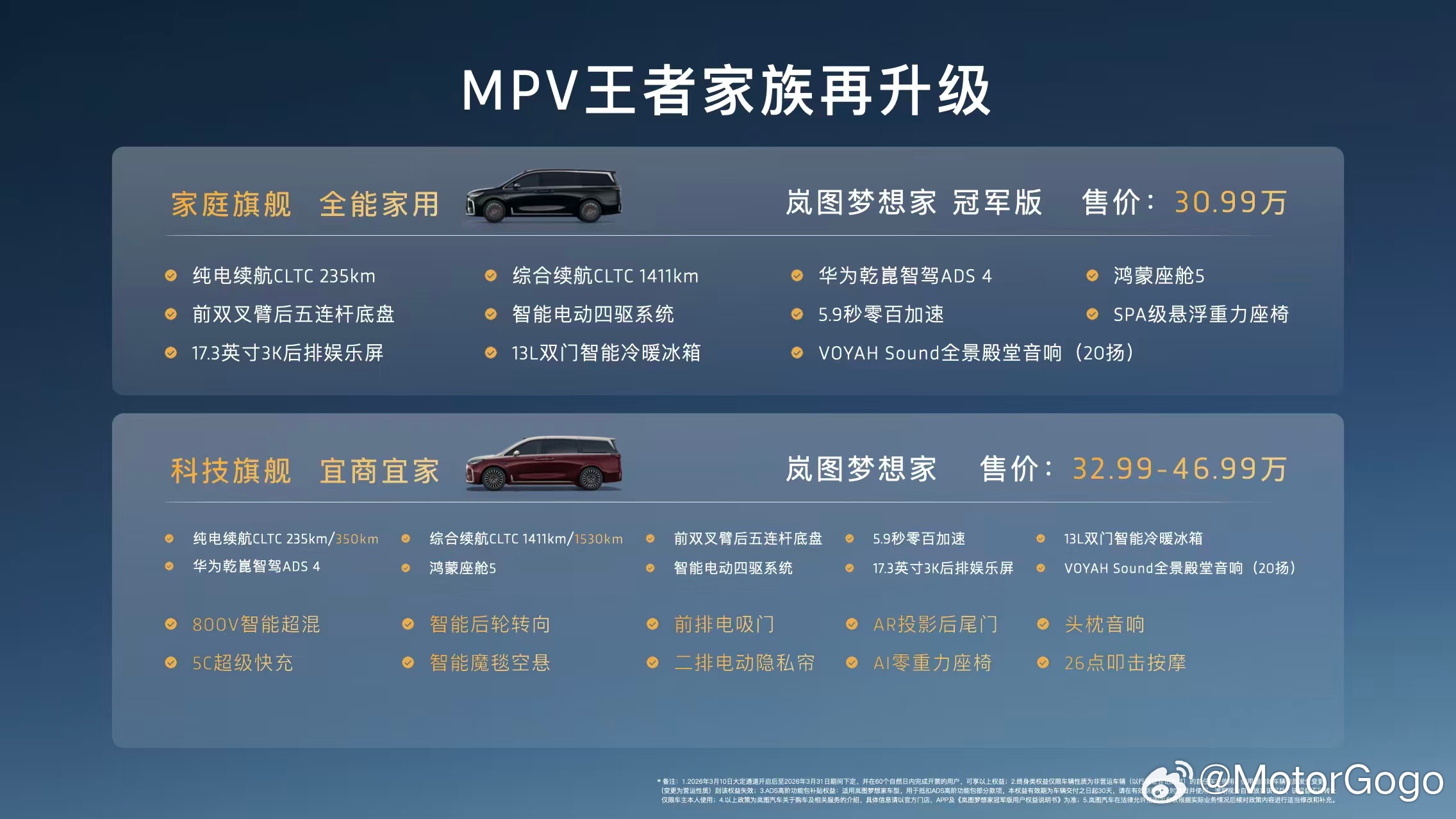 岚图梦想家冠军版 30.99 万元。纯电续航还是235公里。看了一下配置,华为 ADS 4.1、车载冰箱,后排屏,二排重力座椅,这些都标配的。