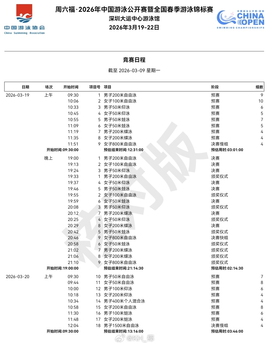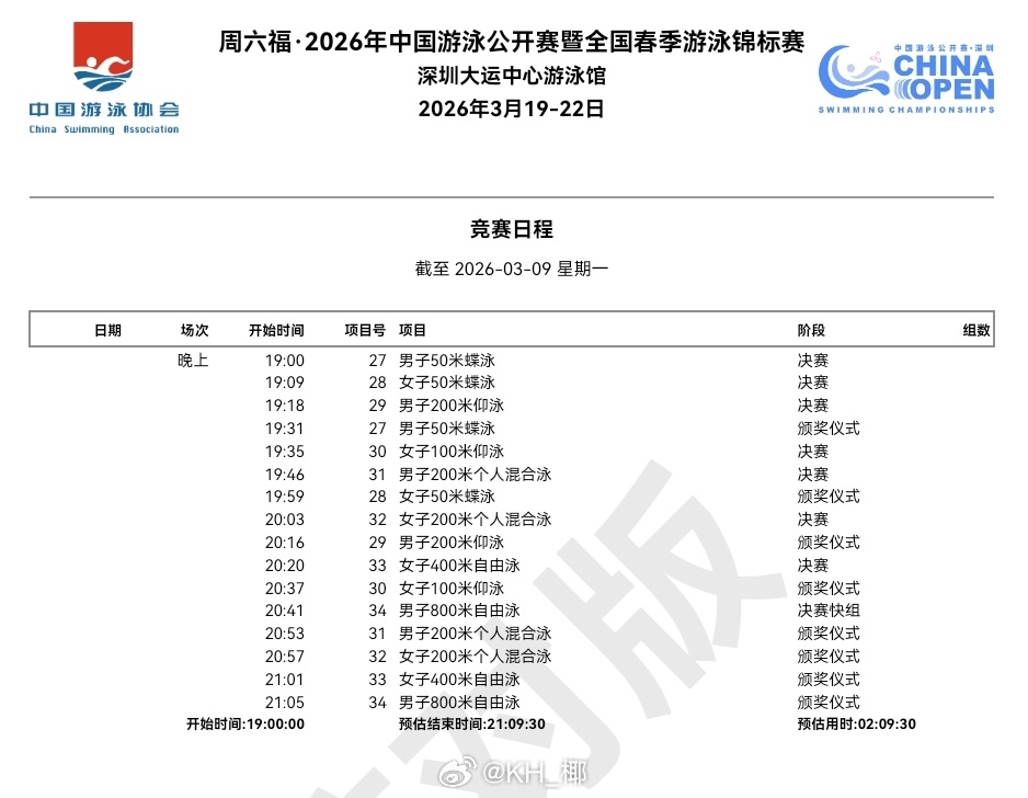 2026年中国游泳公开赛 竞赛日程