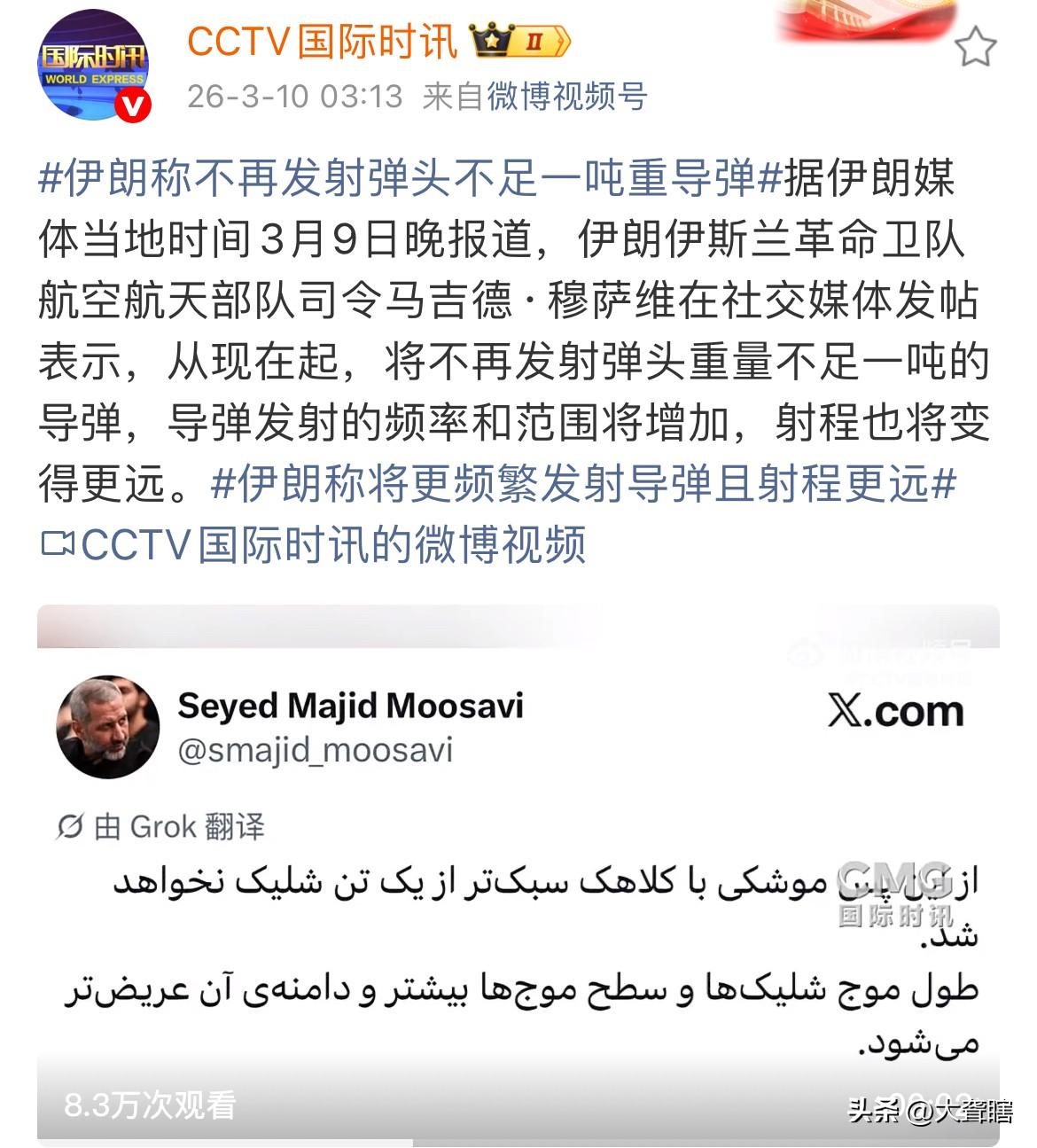 越打越猛,伊朗称低于一吨重弹头的导弹就没必要发射了。 伊朗革命卫队航空航天部队司令马吉德•穆萨维表示,现在起不会再发射弹头重量少于一吨的导弹,并且还要增加导弹发射频次及扩大打击范围。 有消息称,伊朗将重点打击以色列各大港口、摩萨德总部、空军基地以及情报官员等等。