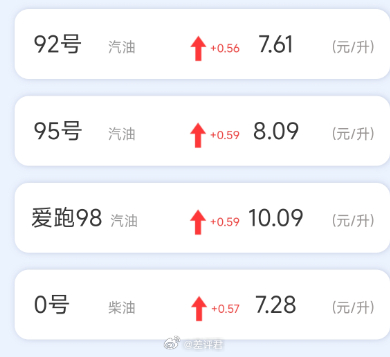 #差评说车# 95号汽油重回8元时代了。89、92、95全线涨价,连爱跑98都涨了。。。