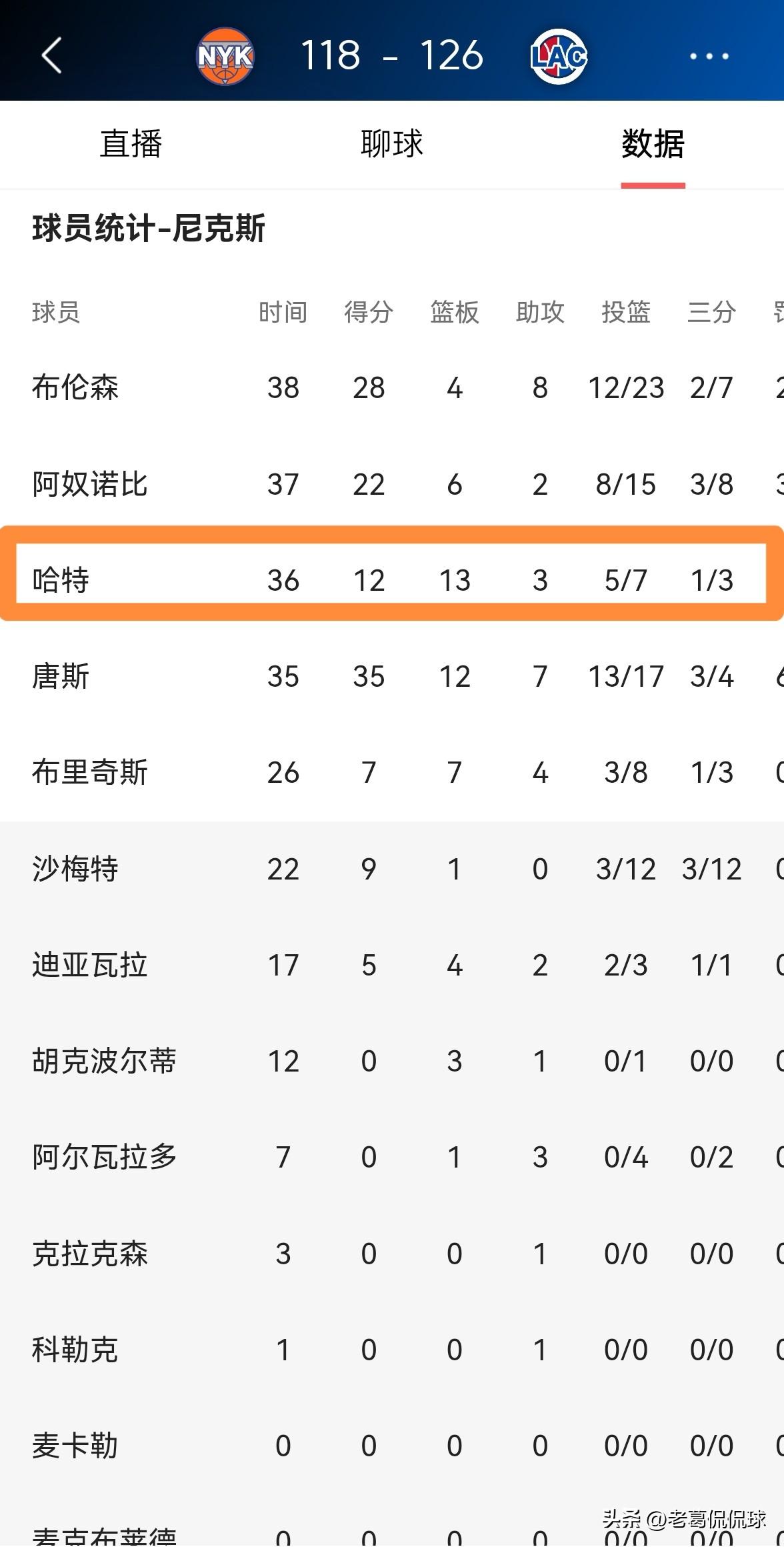 尼克斯大将哈特真是名副其实的拼命三郎!虽然今天尼克斯在客场以118:126不敌快船,但是哈特在场上一如既往的拼尽全力,属于典型的拼命三郎。 全场比赛下来,哈特首发出战36分钟,投篮7中5,其中三分球3中1、罚球1中1得到12分,还有13篮板3助攻。 对于一名得分后卫来说,哈特本场比赛拼抢到了全队最多的13个篮板,这充分说明哈特在场上的拼搏精神。