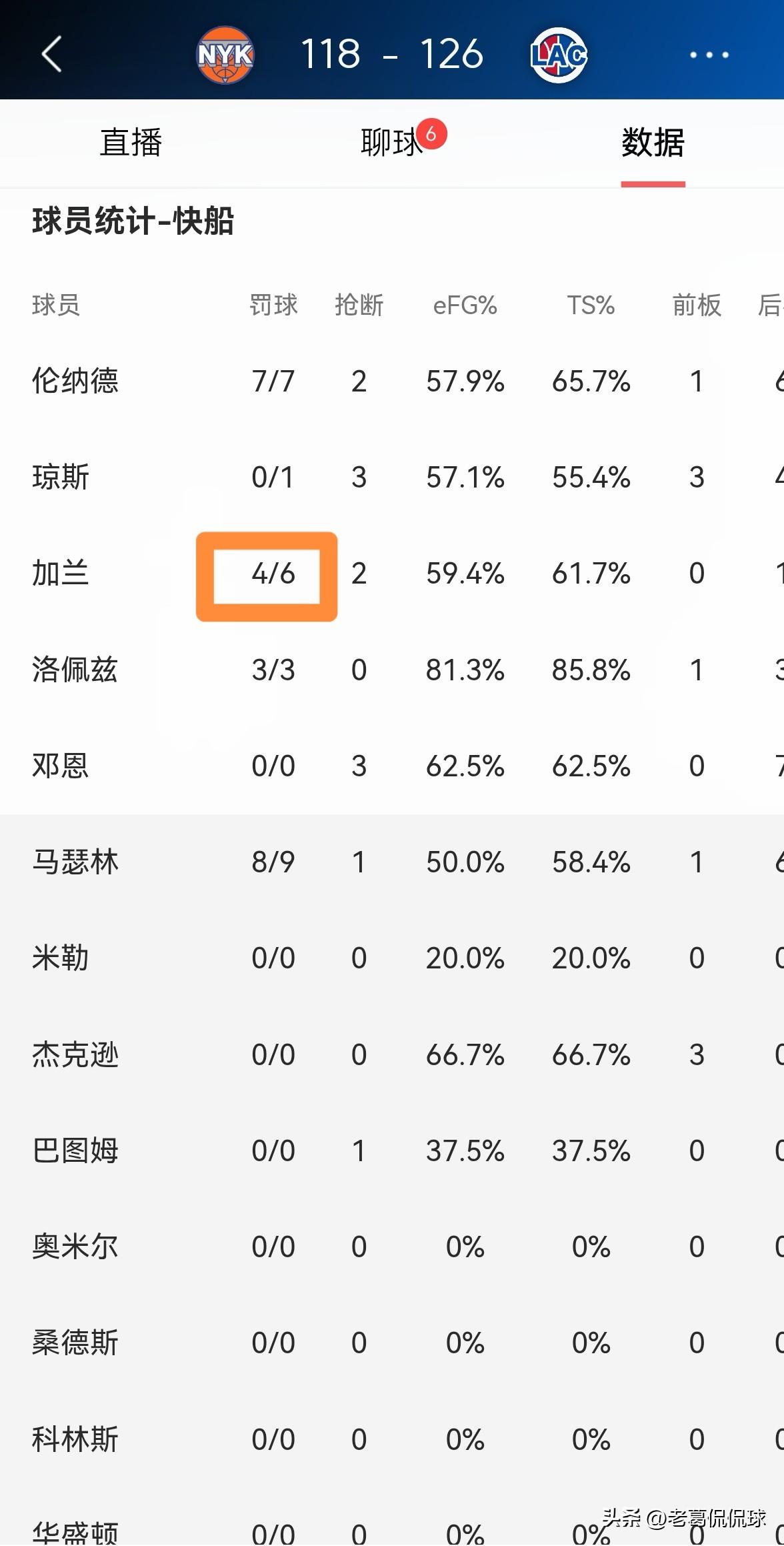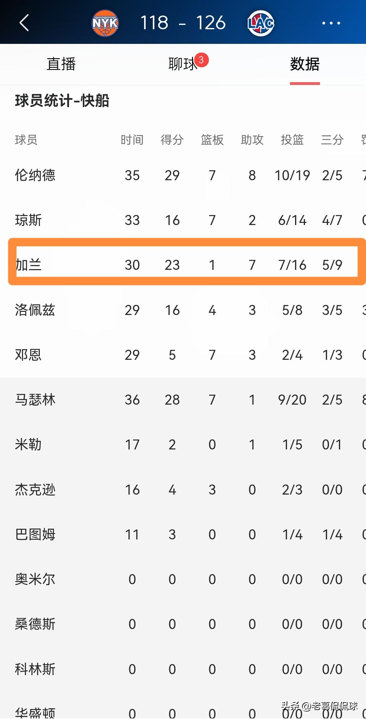 快船当家后卫加兰的造犯规能力真是不如哈登!在今天快船主场以126:118战胜尼克斯的比赛中,虽然加兰在三分线外表现出色,但是加兰在持球强杀篮下造犯规方面确实远远不如哈登。 整场比赛下来,加兰首发出战30分钟,投篮16中7,其中三分球9中5、罚球6中4得到23分,还有7助攻2抢断,他的场上正负值为+20。