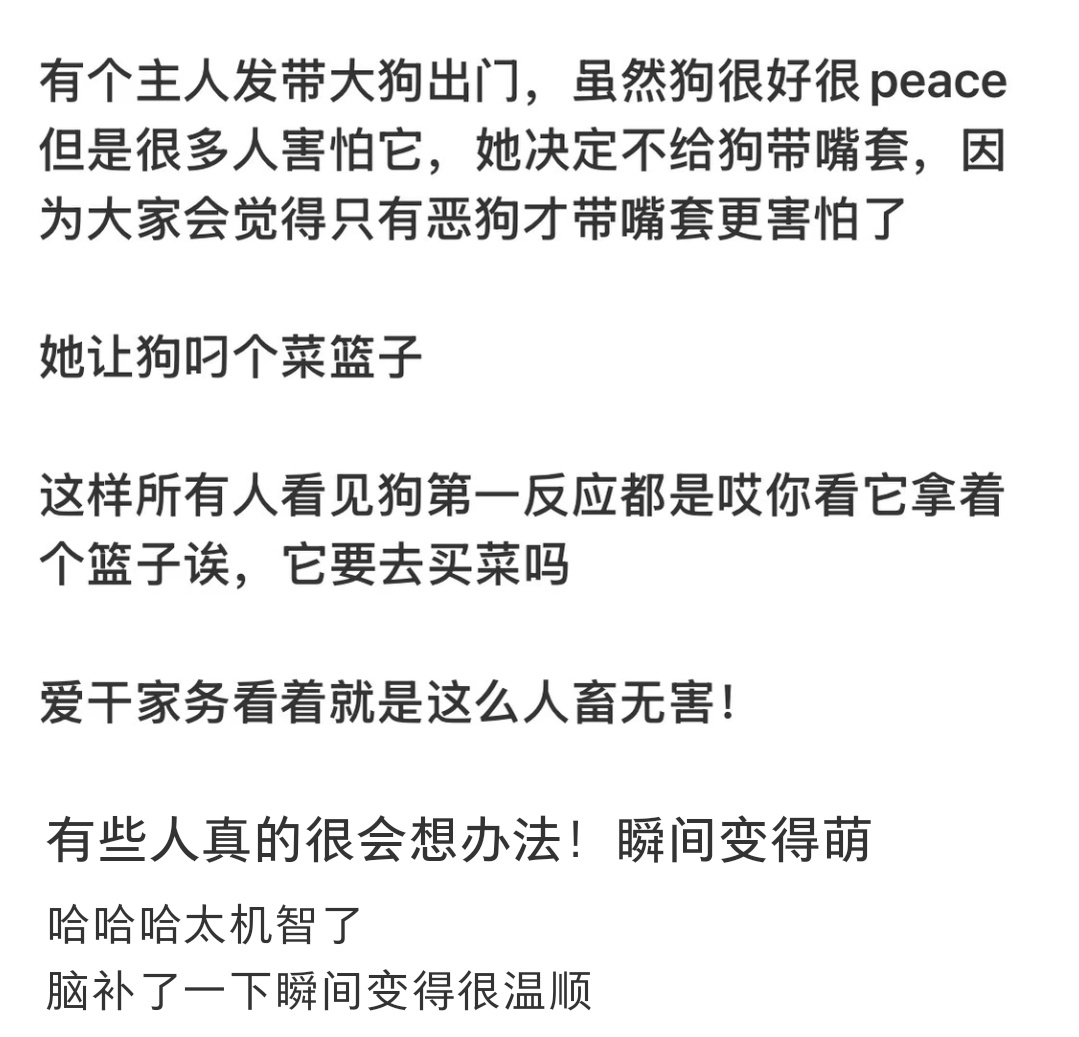 哈哈哈大狗出门的时候嘴里叼个篮子或者玩具,看起来就会特别的无害