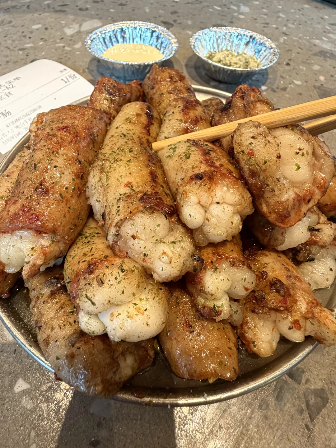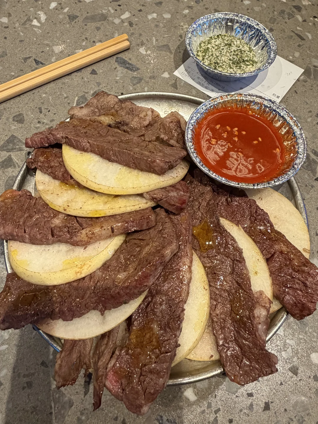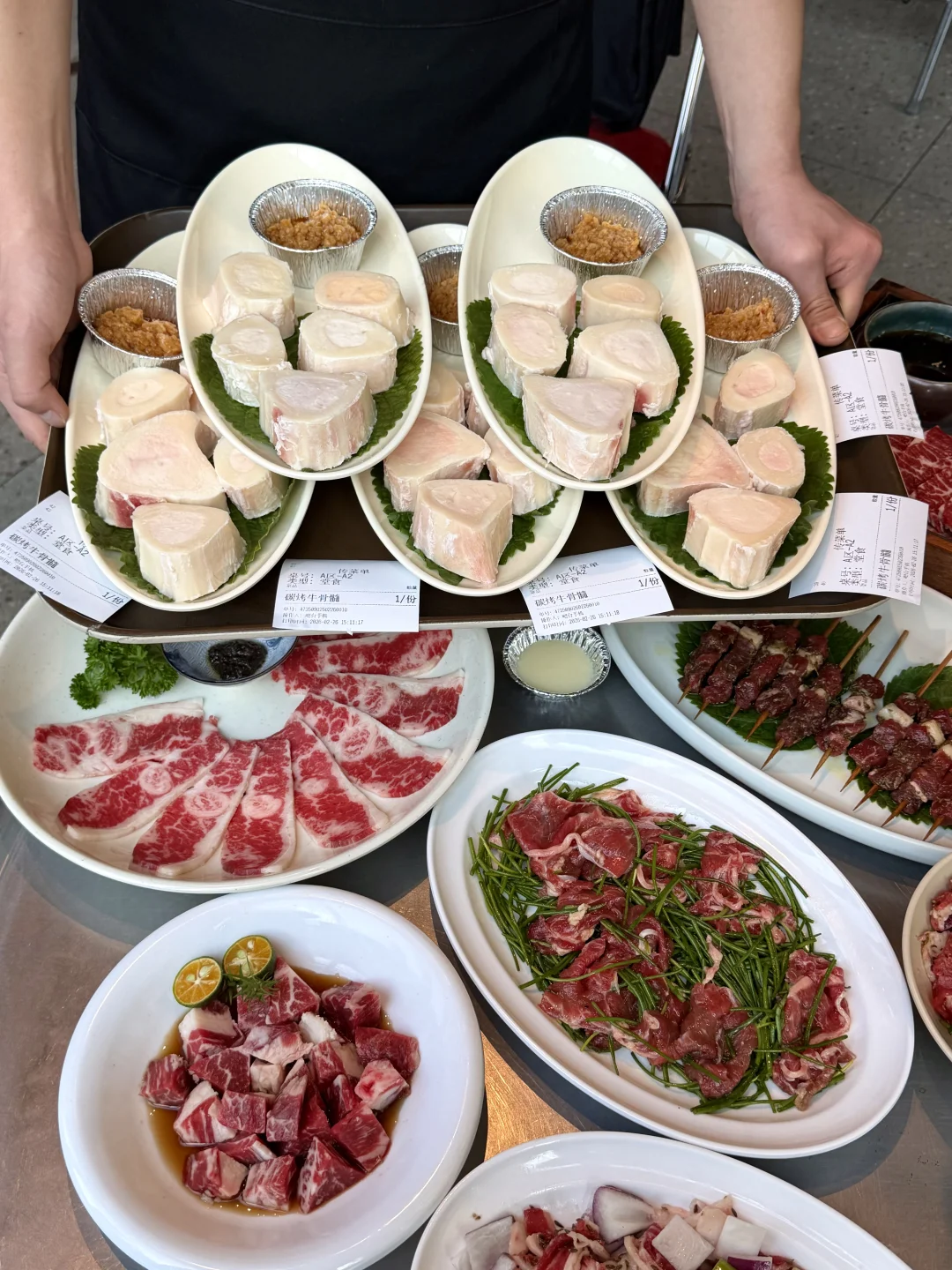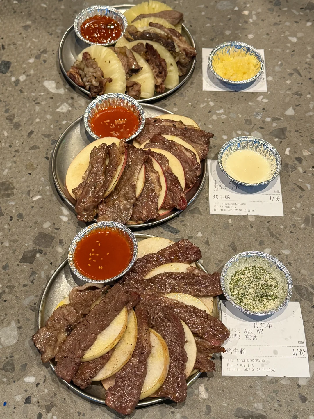 来北京玩几天,已经三刷了,好吃不贵! 在SKP北侧,本地朋友带俺来的,她每次逛完街都会来这里吃!齐齐哈尔的肉,怪不得品质那么好! · 洋葱拌肉、烤牛肠、烤牛骨髓、烤牛肋条、烤芝士条,每次都会点! 尤其是洋葱拌肉嘎嘎香,肉很嫩!齐齐哈尔运来的牛肉,和洋葱现拌,每次来都会点两盘! 烤牛肠很Q 一点也不腻人! 水果烤肉,真的意外的好吃,水果夹着烤肉,很清爽 📍火财盒·非遗烤肉(华贸旗舰店) ·