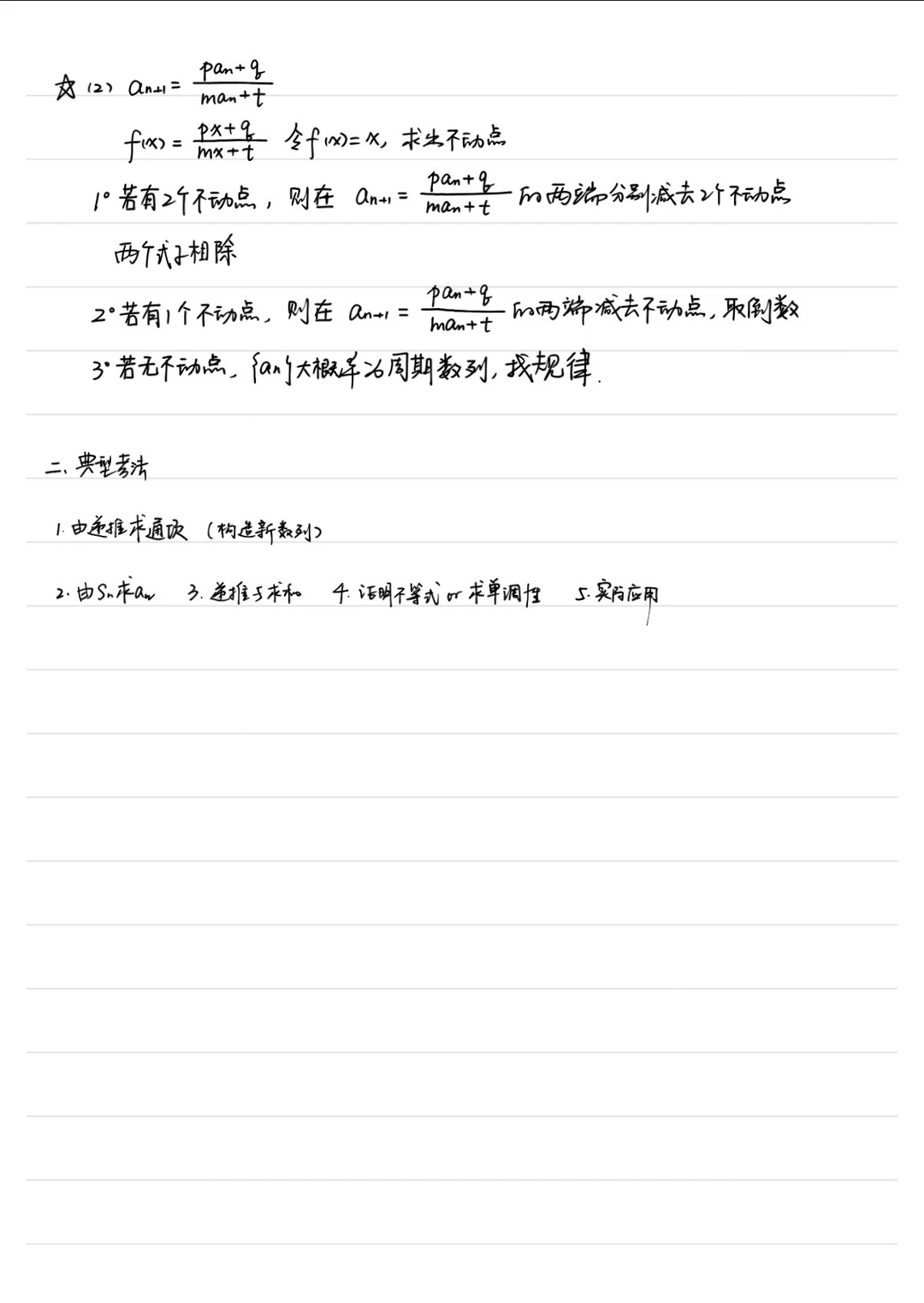 这个课时我是先喊学生做了第三页的题,然后自己回忆总结各种求通项公式的方法,然后我给学生讲解有难度、容易错的题,把方法进行归纳,强调一些易错点,视频已经更新了,这里补一下教案。 最后补充了一下不动点法和特征根法求数列通项公式,不要求学生掌握,作为拓展。