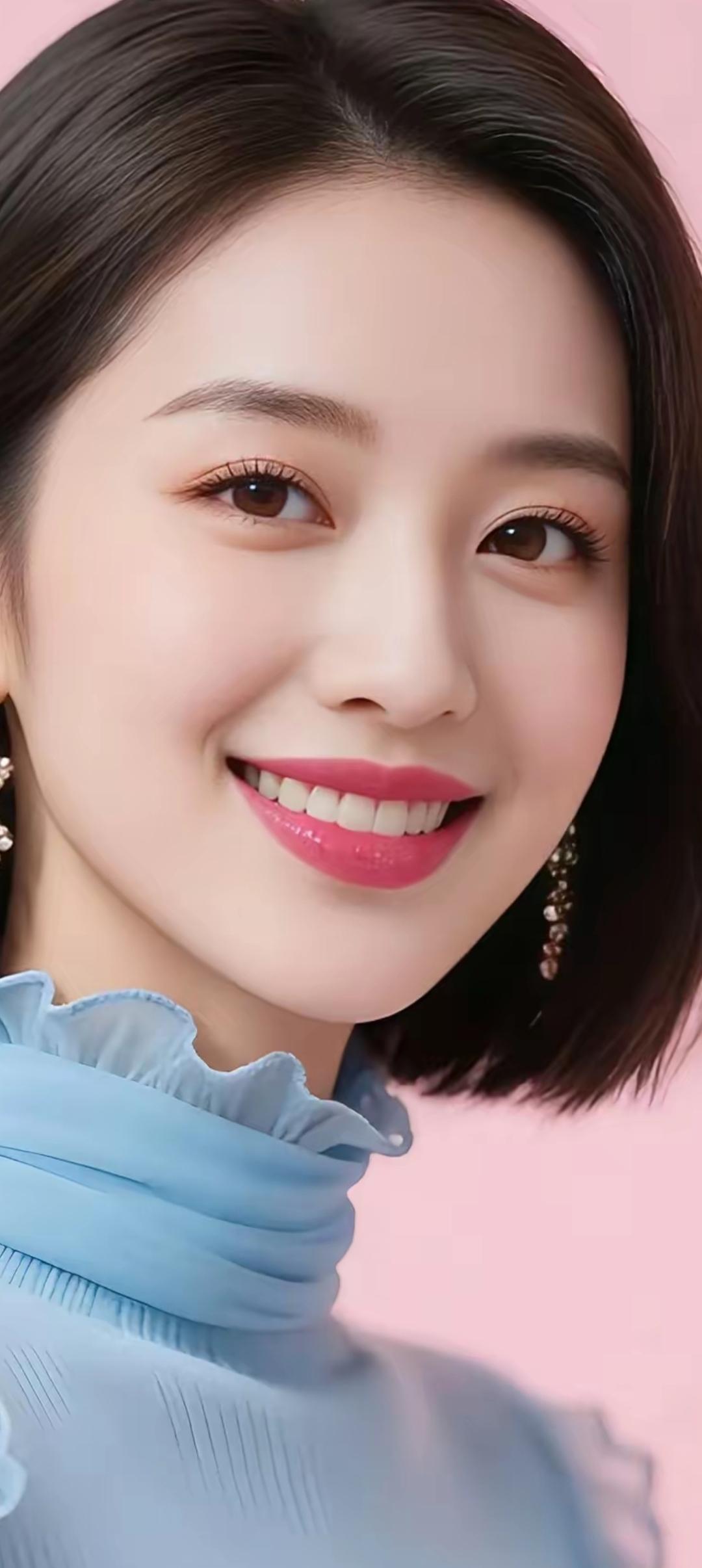 甜美笑容,粉色背景,蓝色荷叶边上衣,优雅气质