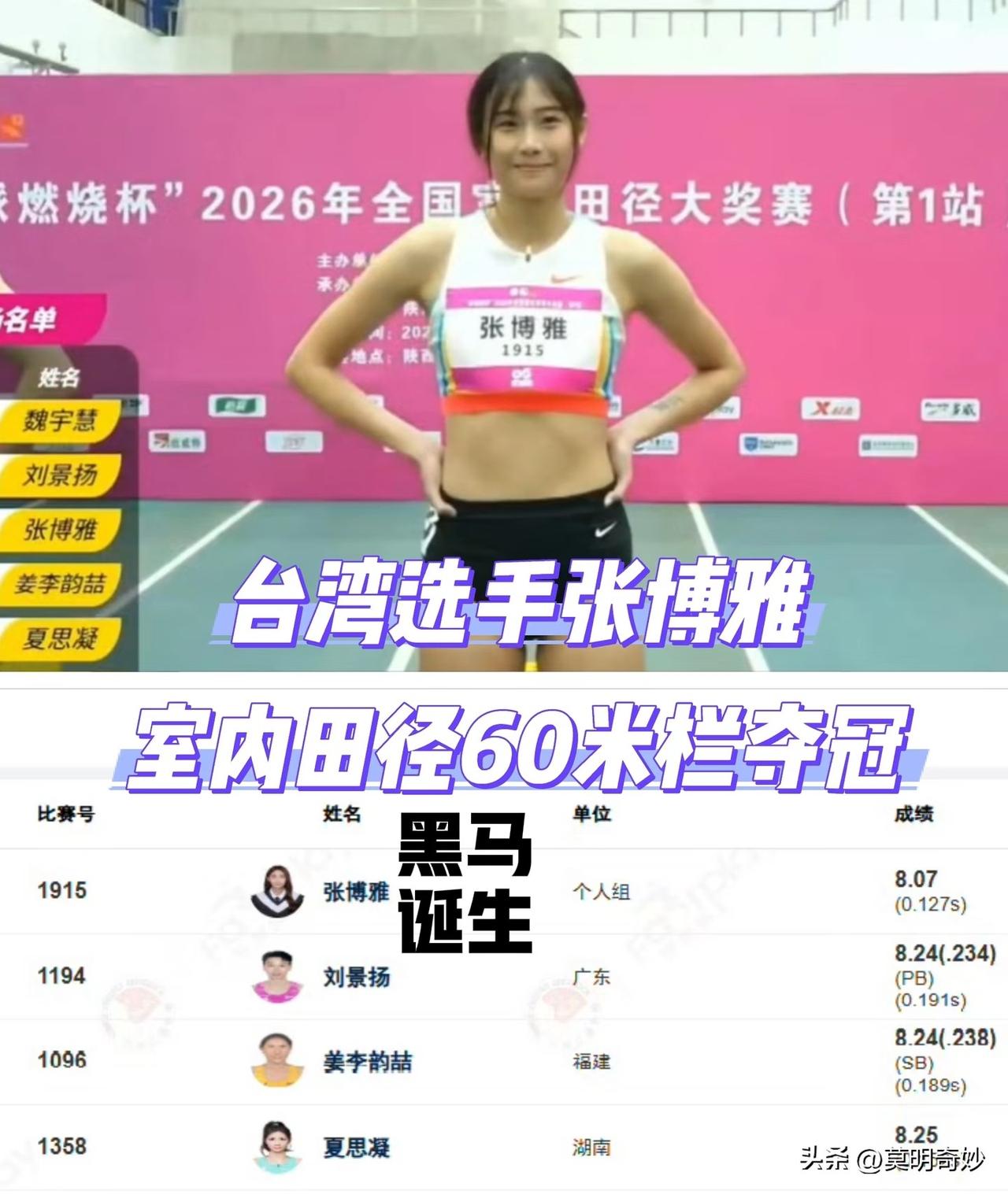张博雅黑马横空出世,中国女子百米跨栏迎来台湾23岁新势力:阿美族少女张博雅在刚刚结束的西安60米跨栏比赛,她力压亚运冠军刘景扬夺得金牌! 2003年4月出生的中国台北跨栏新星张博雅,出身田径世家,父亲曾练跳高、母亲是跨栏选手,早年主攻短跑,21年转攻100米跨栏,短短数年完成从短跑选手到短跨新锐的蜕变。 她的成长之路满是坚韧。出身普通家庭,父亲打零工、母亲做美发,家人却全力托举梦想。国三时曾因脚趾骨裂休战半年,伤病未磨灭她的斗志,反而在复健中打磨出更强的意志力。2023年杭州亚运会获第四名,2024年巴黎奥运会以国际奥委会保障名额参赛,积累宝贵大赛经验。 2026年她突然爆发!2月天津亚洲室内田径锦标赛,她以8秒12力压日本选手中岛瞳夺冠;3月西安全国室内田径大奖赛再斩桂冠,跑出8秒07的个人最佳。 她起跑反应迅猛、栏间节奏精准,这位阿美族少女正以凌厉姿态,成为亚洲女子短跨界不可忽视的新力量。 张博雅室外100米栏最佳13秒05,杭州亚运会第四名,实力稳步提升。与国内名将相比:吴艳妮12秒74、林雨薇12秒74、刘景扬12秒81、夏思凝13秒08。张博雅已超越夏思凝,接近国内一线梯队,室内成绩更是亚洲顶尖,未来潜力巨大,他和夏思凝一样,都是23岁的黄金年龄,前途无量,可以预见老将新人们将在未来的竞争中使这项比赛越来越有看点! 女子60米跨栏 吴艳妮 林雨薇 刘景扬
