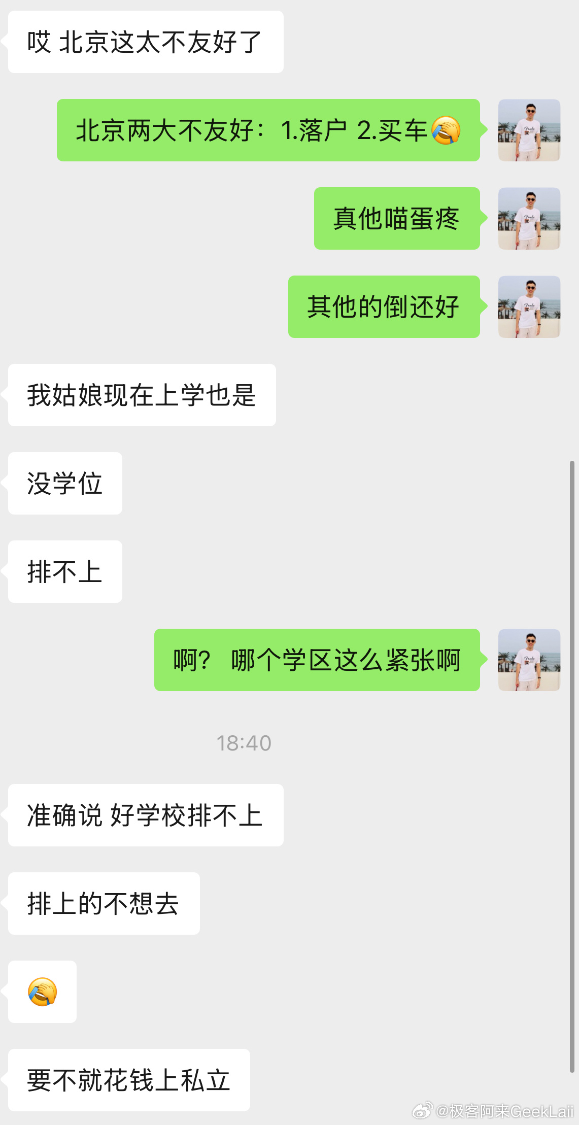 一个朋友本来想找我买辆二手特斯拉在北京租个指标上牌,但是这样就没法贷款了…哎,我18岁来北京,也马上13个年头了虽然我是既得利益者,但我还是想说,北京对新来的年轻人政策太不友好了:1.落户 2.买车。这两点的难度在全国都属于独一档,地狱级难度,北京自己是第一梯队,其他城市都比较简单。 这两点也导致了很多在北京的人很难拥有自己的车,很难在这个城市获得归属感。北京其他的都挺好的,政府办事效率也蛮高的短视频刷到过很多次,在北京奋斗了10几年的夫妻俩因为孩子上学没有户口的问题不得已离开北京去了杭州等城市… 我身边也有很多在北京混不下去的朋友去了成都、天津 等等… 但是身边很多顶级人才、学霸 确实继续留在了北京,毕竟这里拥有全国最牛逼的教育、医疗、金融、科技资源…对于我一个黑龙江长大的人来说,北京的气候非常舒服 适合我,希望北京越来越开放包容,吸引更多优秀人才 北京