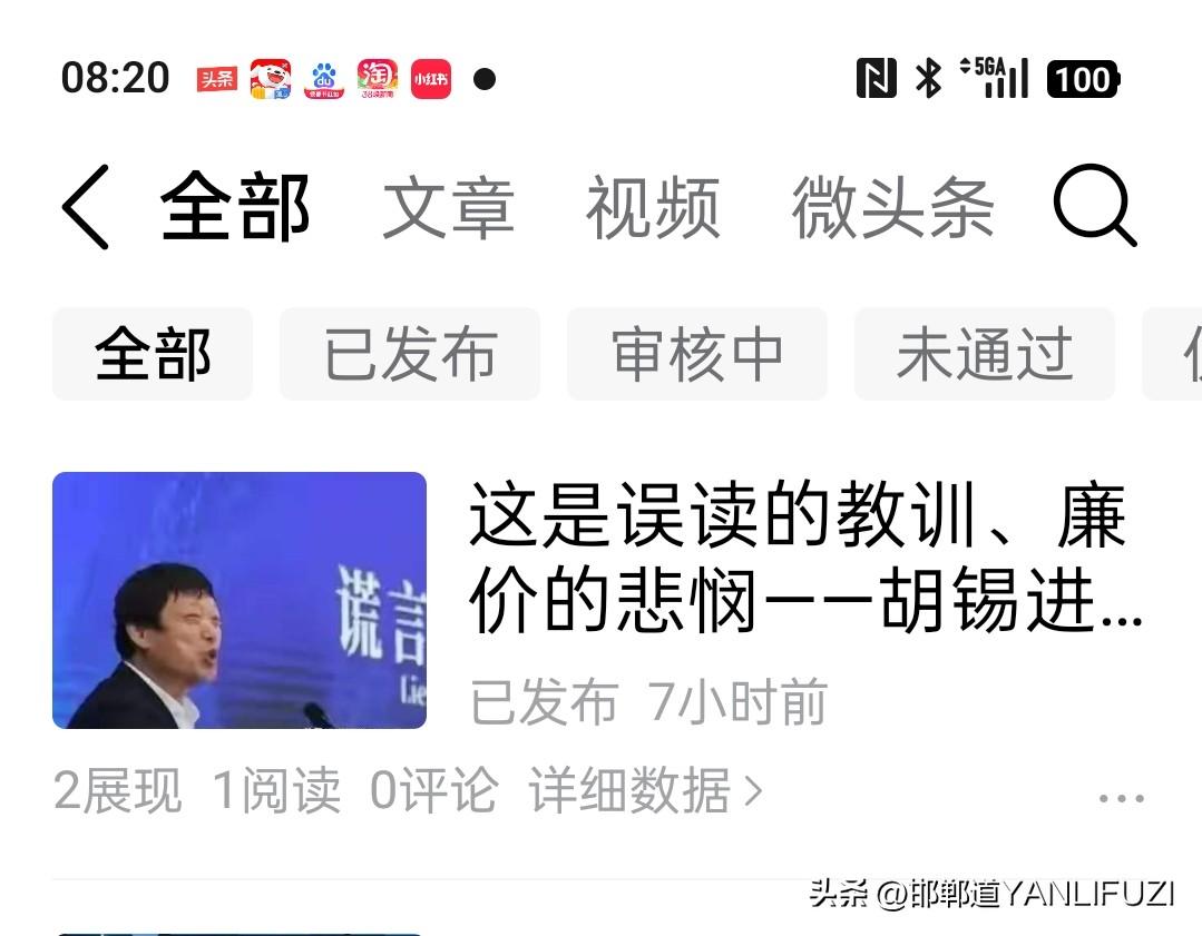 这几天,我的头条发文经常高爆。 展现量不断超百万,阅读量超10万的,比比皆是。 我发现还是有秘密的。 比如这篇展现量120多万,阅读量17万多,首先是标题吸引人。 标题分三段,前两段都吸引人。 第一段是,绿营全线改口,加一个惊叹号。这里边有“全线”二字。肯定吸引人,因为有悬念。人们一定要问,出了什么事,为什么要全线改口呢? 第二段是,3月5日绿媒首次称“中国大陆”。3月5日就是当天,绿媒首次称“中国大陆”,这是怎么回事人们一定好奇。 所以,就爆了。 还有一点更重要。就是要相信一秒钟灵感。 在发文前,你如果一秒钟就感到是好题材,而且一秒钟就想清了该写些什么,立即动手一气呵成,这样的文章发出去,几乎都会爆。 但是,你如果一秒钟感到了是个好题材,只是大致想清了怎么写,但当你开始写后,需要反复琢磨,反复查资料,费时又费力,一般情况下,这文章往往石沉大海,写得再好也没用。 我有篇文章。看到后,觉得如梗在喉,不吐不快,但写起来特别费力,需要反复琢磨,反复查资料,结果耗费了5个小时,写出了这篇4500字的长文。结果发出来7个小时,只有2个展现,2个阅读,点击率倒是不错达到了100%。 各位可以点开看看,我今天重点把这篇推荐给您,让你们评评写得好不好?