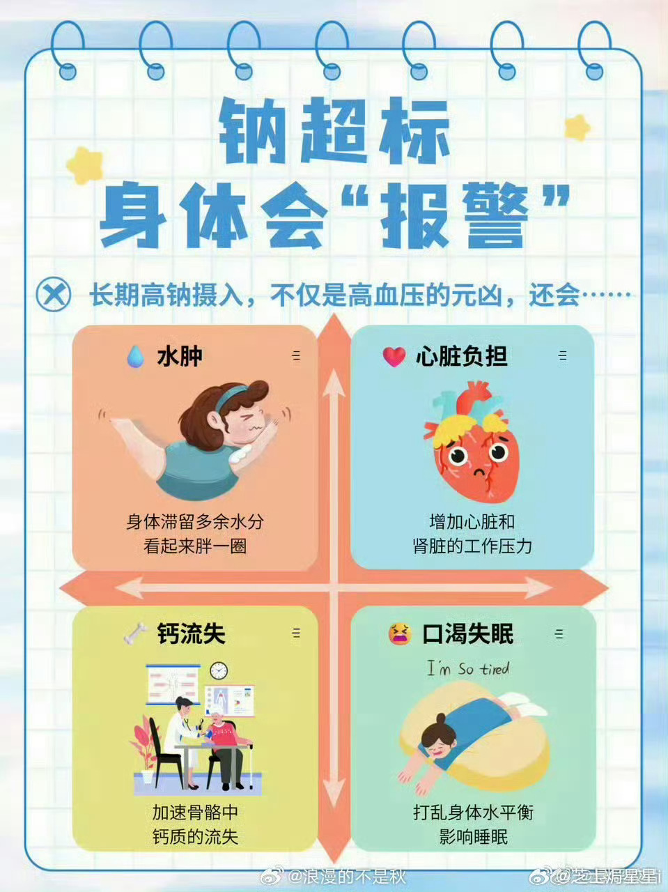 钠摄入超标危害竟然这么多 长期钠摄入超标会悄悄影响健康,很多人日常都在不知不觉中过量。少盐少鲜,别同时用味精、鸡精、蚝油,优先选择减钠调味品,科学控钠更安心。钠摄入超标身体会怎样