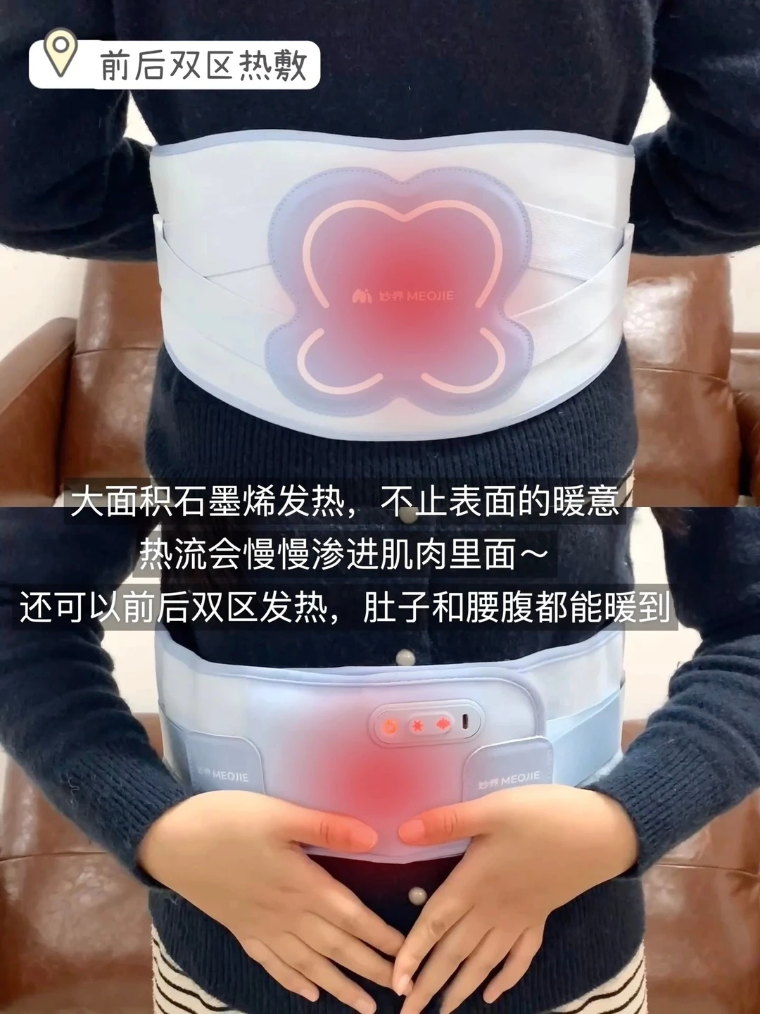 3档恒温热敷功能♨️,石墨烯发热很均匀,不会忽冷忽热,还可以搭配爱草包使用,腰腹暖呼呼很舒服