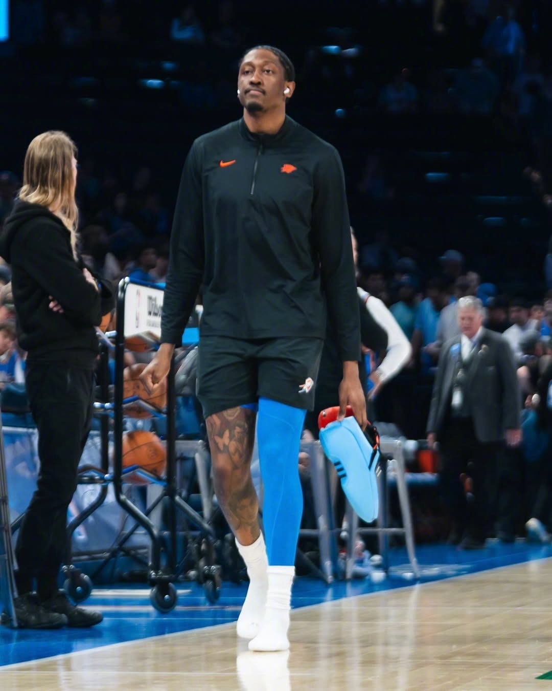 杰伦·威廉姆斯在对阵掘金队的赛前热身中首次亮相了新款鸳鸯配色的“OKC Thun