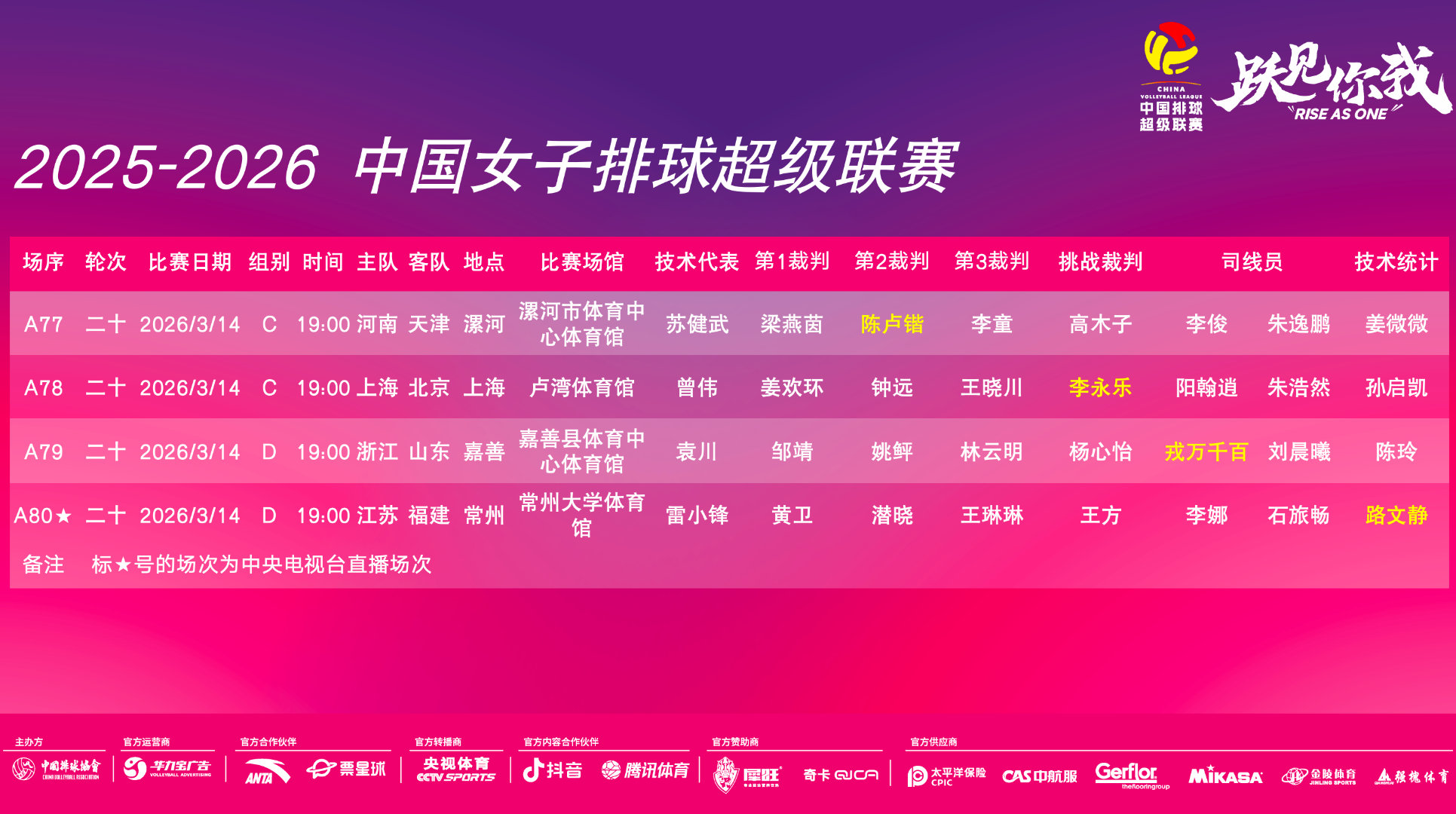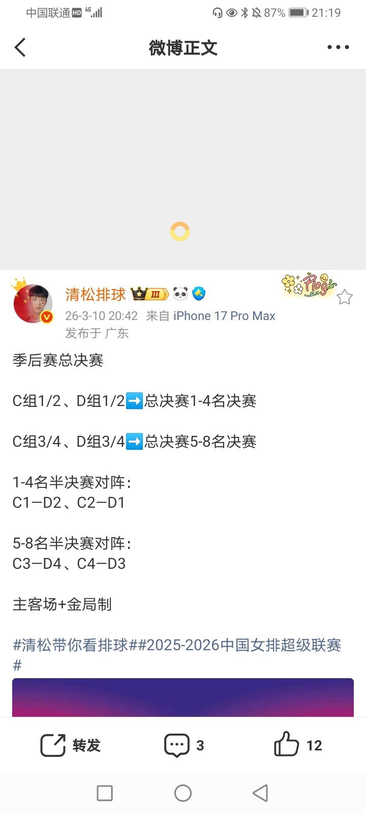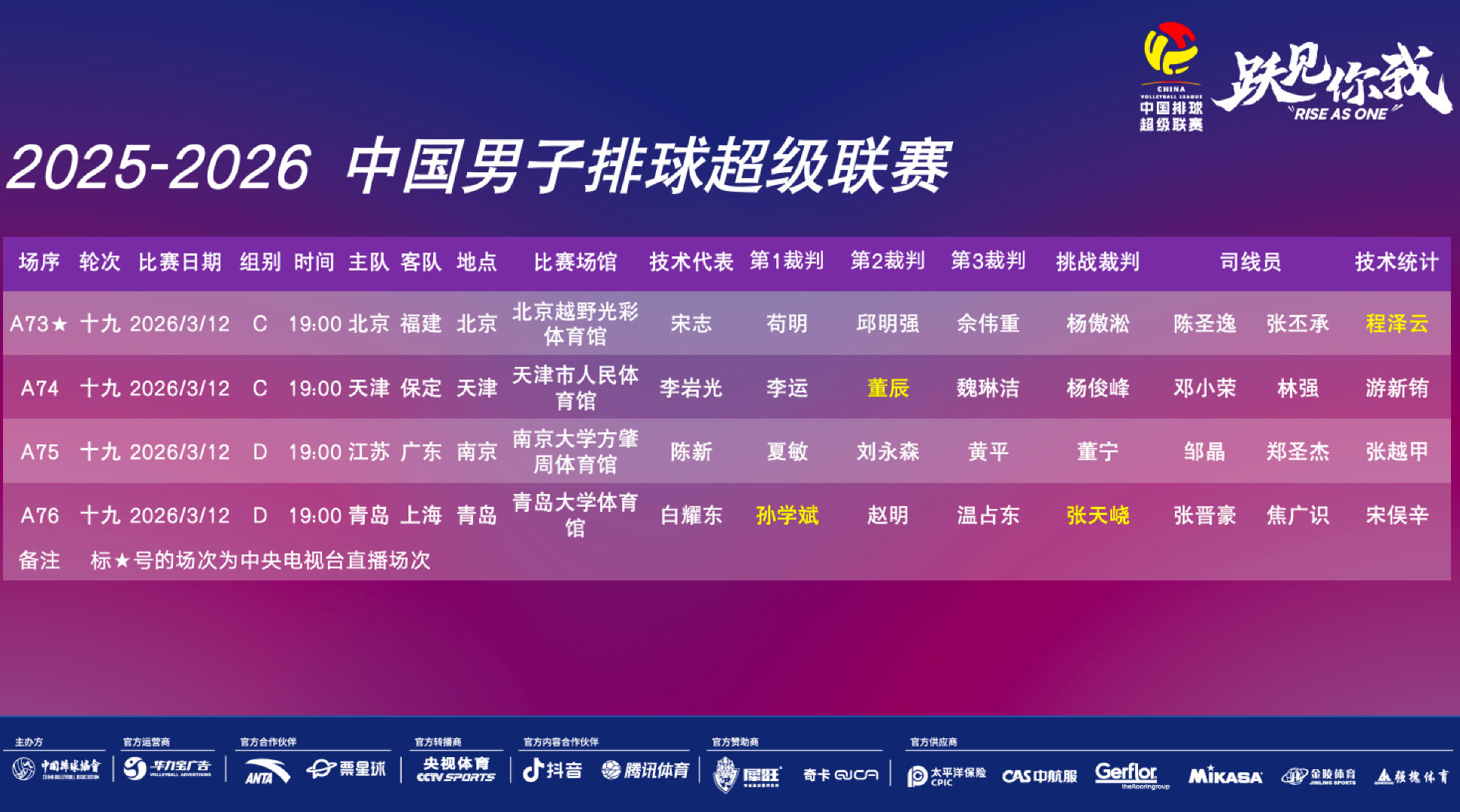 2026年3月11日-2026米兰.科尔蒂纳冬残奥会轮椅冰壶混合团体循环赛 英国-意大利/中国4-9加拿大(卫冕冠军中国轮椅冰壶混合团体队终结四连胜 遭遇首败)/拉脱维亚5-9中国/韩国-挪威/冰球小组赛 美国7-1大胜中国(上届季军中国残奥冰球队终结两连胜 遭遇首败) 2026米兰.科尔蒂纳冬残奥会轮椅冰壶混双半决赛 中国8-3大胜拉脱维亚(中国轮椅冰壶混双队晋级决赛)/韩国6-3美国 2026女足亚洲杯小组赛C组第3轮 印度1-3中国台北(中国台北女足获得两连胜 2胜1负 小组第二/印度女足遭遇三连负 小组垫底)/日本4-0大胜越南(日本女足获得三连胜 小组第一/越南女足遭遇两连败 1胜2负 获得小组第三 无缘8强) 2025-2026女排超级联赛A级季后赛第5轮(第19轮) 河南2-3惜败北京(16-25 25-23 13-25 25-19 11-15)(北京女排终结三连败 /河南女排遭遇三连败 小组垫底 双方均无缘半决赛 将参加5-8名排位赛)/天津3-0上海(25-20 25-20 25-21)(天津女排获得三连胜/上届亚军上海女排终结十三连胜 并遭遇季后赛首败 双方均晋级半决赛) 2025-2026女排超级联赛B级季后赛第二阶段C组9-12名排位赛 江苏青年队3-2险胜战胜福建青年队(25-21 22-25 25-16 17-25 15-8)(江苏青年女排终结三连败/福建青年女排遭遇十连败)/山东青年队0-3辽宁青年队(15-25 20-25 22-25)(山东青年女排遭遇十连败) 1/4决赛 上海青年队2-3被辽宁逆转(24-26 25-23 25-20 18-25 11-15)(上届季军辽宁女排获得四连胜 艰难晋级半决赛 半决赛将对阵江西女排)/上海青年女排遭遇两连败 将参加5-8名排位赛)/四川1-3云南(18-25 25-18 15-25 24-26)(云南女排晋级半决赛 半决赛将对阵深圳女排/四川女排终结三连胜 将参加5-8名排位赛)/江西3-0南京师范大学(25-20 25-22 25-16)(江西女排获得两连胜 晋级半决赛/南京师范大学女排将参加5-8名排位赛)/深圳3-0河北(25-15 25-11 25-15)(深圳女排获得八连胜 晋级半决赛/河北女排将参加5-8名排位赛) 2025-2026男排超级联赛B级季后赛第二阶段C组9-12名排位赛 上海青年队3-0广东青年队(25-16 25-12 25-18)(广东青年男排遭遇六连败)/河北青年队3-2险胜福建青年队(18-25 25-22 25-13 21-25 16-14)(河北青年男排终结十连败/福建青年男排遭遇两连败) 1/4决赛 四川3-0河南(25-16 25-17 25-21)(四川男排获得五连胜 晋级半决赛 半决赛将对阵云南男排/河南男排将参加5-8名排位赛)/湖北0-3浙江(22-25 21-25 19-25)(浙江男排获得四连胜 晋级半决赛/湖北男排将参加5-8名排位赛)/中山大学0-3云南(15-25 21-25 25-27)(云南男排获得六连胜 晋级半决赛/中山大学男排遭遇三连败 将参加5-8名排位赛)/辽宁3-0南昌大学(25-15 25-22 25-15)(辽宁男排获得三连胜 晋级半决赛 半决赛将对阵浙江男排/南昌大学男排遭遇三连败 将参加5-8名排位赛) 部分重点赛事预告:CCTV5直播:19:00 2026女篮世界杯预选赛首轮(武汉赛区) 中国-马里 21:30 2026米兰.科尔蒂纳冬残奥会轮椅冰壶混双金牌赛 中国-韩国 CCTV5+直播:13:25 2026女篮世界杯预选赛首轮(武汉赛区) 捷克-南苏丹 16:00 2026米兰.科尔蒂纳冬残奥会轮椅冰壶混合团体循环赛 英国-中国 CCTV16奥林匹克频道直播:16:30 2026女篮世界杯预选赛首轮(武汉赛区) 巴西-比利时 CCTV5客户端直播:16:05 2026米兰.科尔蒂纳冬残奥会轮椅冰壶混合团体循环赛循环赛 拉脱维亚-挪威/美国-韩国/瑞典-斯洛伐克 21:35 2026米兰.科尔蒂纳冬残奥会轮椅冰壶混双铜牌赛 拉脱维亚-美国 19:35(7场)/20:00 2025-2026CBA常规赛第24轮(第二阶段首轮) 山东-江苏/*上海-北京/山西-吉林/深圳-辽篮/北京-四川/天津-浙江/浙江广厦(方兴渡)-南京(同曦) 19:00(2场) 2025-2026女排超级联赛A级季后赛第5轮(第19轮) 福建-浙江/山东-江苏 13:00/15:00 2025-2026女排超级联赛B级季后赛第二阶段C组9-12名排位赛 山东青年队-福建青年队/辽宁青年队-江苏青年队 13:00/17:00 5-8名排位赛 河北-四川/上海青年队-南京师范大学 15:00/17:00 半决赛 深圳-云南/辽宁-江西 13:00/15:00 2025-2026男排超级联赛B级季后赛第二阶段C组9-12名排位赛 河北青年队-广东青年队/福建青年队-上海青年队 13:00/17:00 5-8名排位赛 河南-中山大学/南昌大学-湖北 15:00/17:00 半决赛 辽宁-浙江/四川-云南