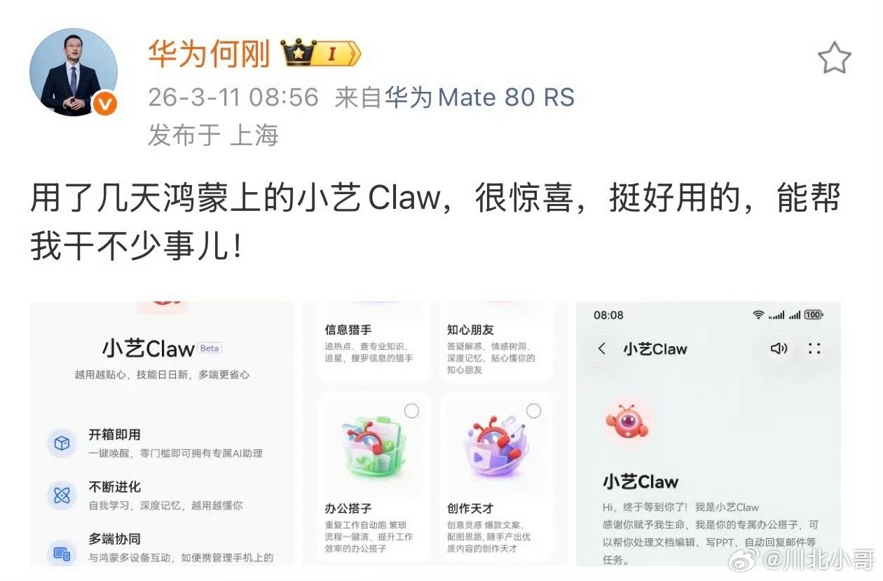 华为何刚晒鸿蒙手机小艺Claw不必去折腾Open claw复杂的安装及配置问题,对于技术小白,拿来就用,简单粗暴,未来估计各大手机厂商都会陆续集中推出🦞版,高度集成并实现安全隐私可控。华为何刚晒鸿蒙手机小艺claw