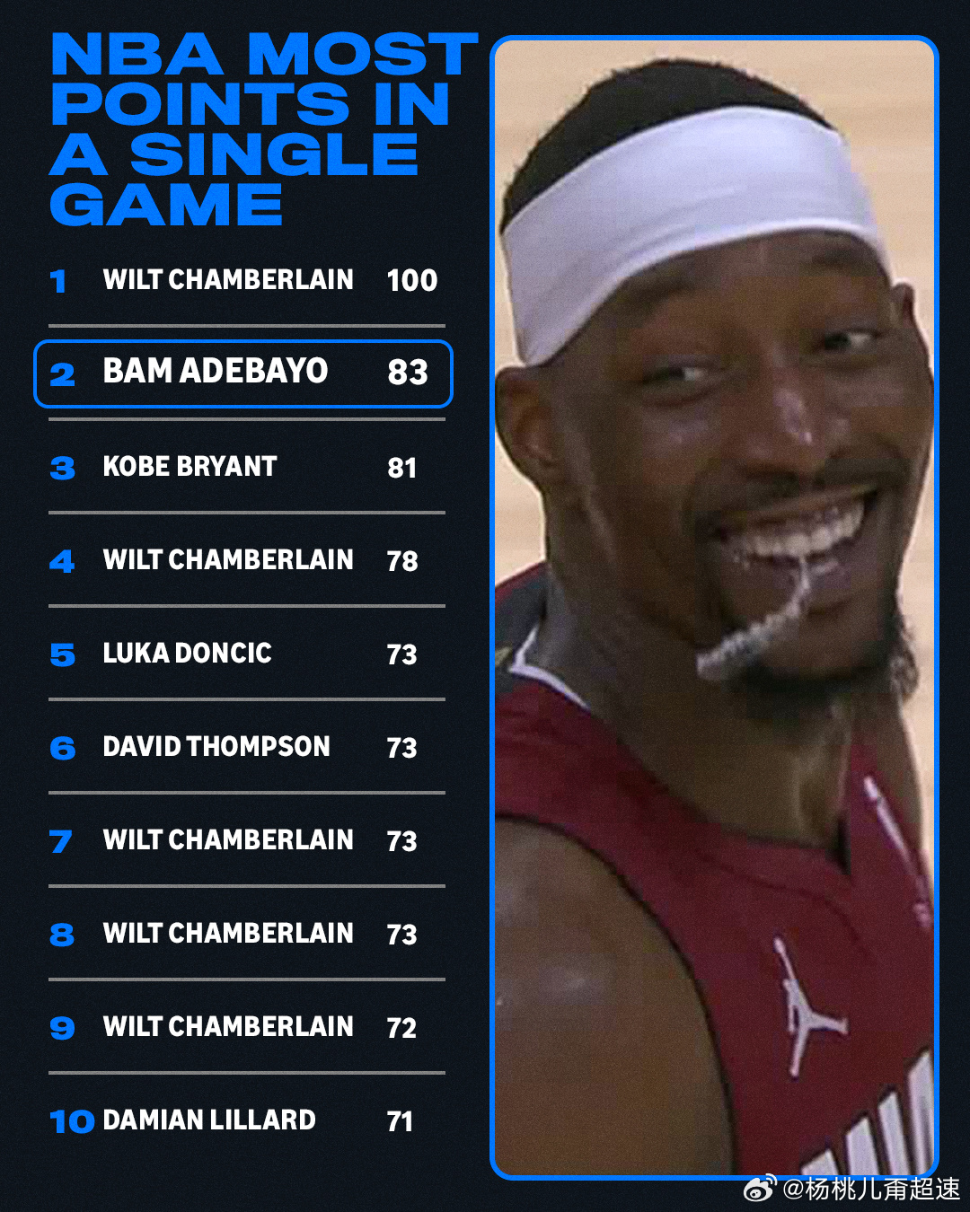 阿德巴约83分阿德巴约,单场83分。。超越了蜗壳 成为NBA历史单场得分第二高。出战41分钟,43投20中,其中三分球22投7中,罚球43投36中,得到83分9篮板3助攻2抢断2封盖。确实是刷子了 赢好几十分也不下去但转头一想 这样的机会 搁谁也想刷一刷吧毕竟…蜗壳81分还是06年的事儿呢,张伯伦100分是1962年阿德巴约现役得分王