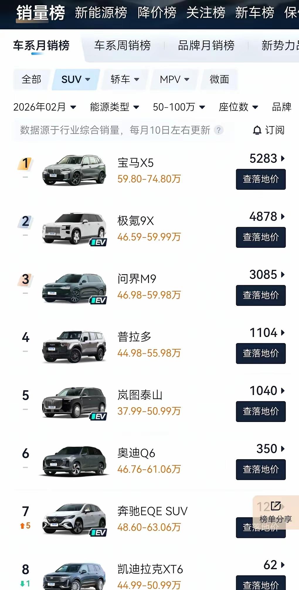 核心问题,X5优惠了多少? x5连续两个月超越问界M9,取得50万级以上豪华车“销冠”。 如果X5是价格不变,取得这个成绩可以证明它的竞争力。 如果是以价换市,就是另一个问题了。 26年M9要换款了!M9换款后X5还能保证销冠位置,那就说明X5还能打,基本盘稳。