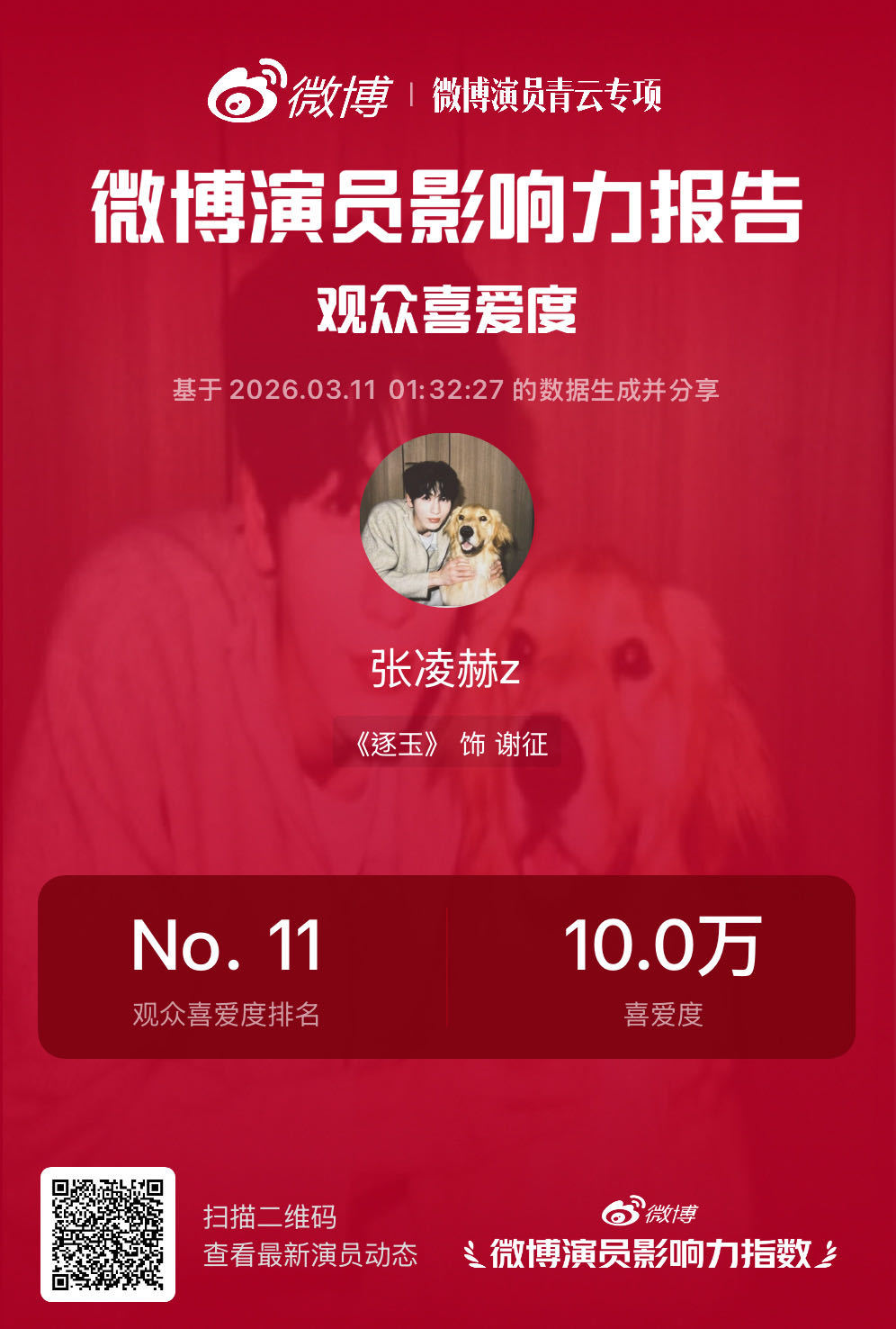 张凌赫谢征观众喜爱度破10万 恭喜谢征观众喜爱度成功破10万🎉喜爱度增长离不开对角色的认真诠释。无论是人物状态还是情绪表达,都让谢征这个角色更有记忆点。10万喜爱是热度上升的体现🔝也是观众对于角色最好的认可✨戳👉微博演员影响力指数 一起为你喜爱的演员打call!微博演员影响力