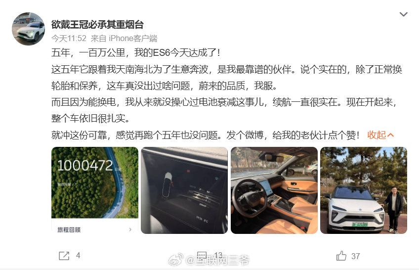 蔚来ES6五年跑出百万公里 这个属实是把换电用到位了啊!