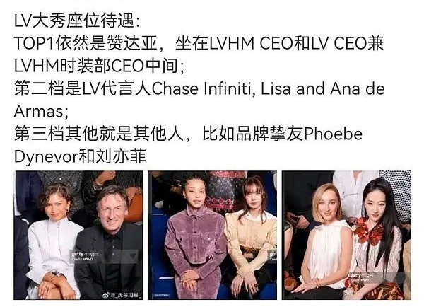 刘亦菲lisaLV大秀待遇 网友热议lv大秀 刘亦菲和lisa待遇刘亦菲:认领晚,座位位置一般,有LV130周年重磅企划全球大地广Lisa:认领早,座位好,有正季成衣地广及lvmh官网首页及财报封面