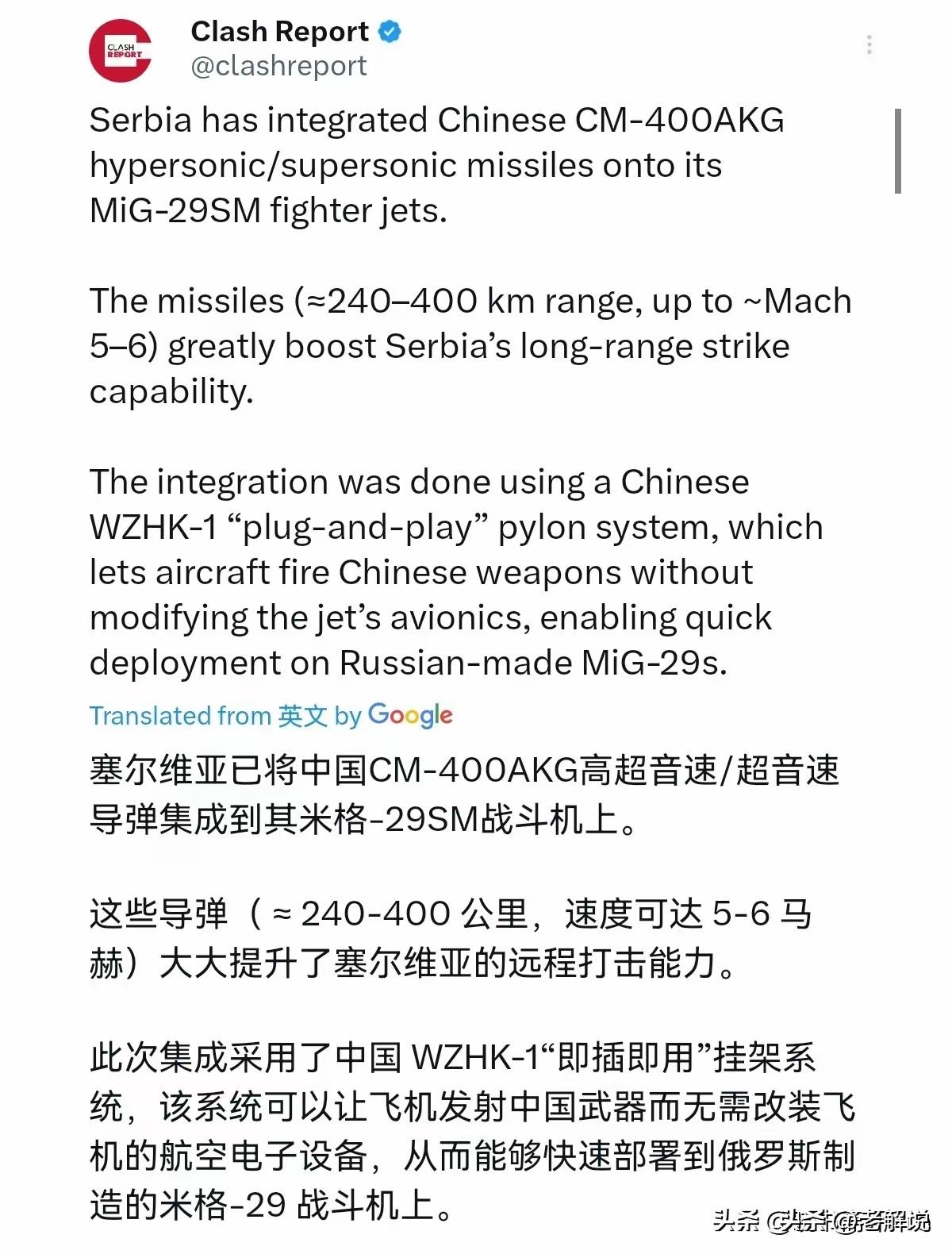 塞尔维亚受刺激了!塞尔维亚成为了欧洲首个列装中国超音速空射导弹的国家!塞尔维亚紧急将中国CM-400AKG高超音速导弹集成到其米格- 29战斗机上。3月11日,根据外媒报道,就在中东局势紧张之际,塞尔维亚紧急将射程240-400公里,速度高达~ 5-6马赫的CM-400AKG高超音速集成到了米格- 29战斗机了。外媒称,这一挂载将极大地增强塞尔维亚的远程打击能力。 这事儿挺有意思的,简单说就是塞尔维亚给自家的老款米格-29战斗机装上了中国造的CM-400AKG超音速导弹,一下子让老飞机有了远程“点穴”的本事。 首先,这导弹确实厉害。它速度能到4到5马赫,射程最远能到400公里左右,从高空打下来,一般的防空系统很难拦住。而且它自己能导航,飞机扔完就能跑,不用管后续,安全又高效。以前塞尔维亚的米格-29只能挂点火箭弹或者射程很近的导弹,想打地面目标得飞到敌人眼皮底下,非常危险。现在有了这个,可以在几百公里外就发动攻击,战力直接升了一个档次。 最关键的是怎么装上去的。中国的军工想了个巧办法,搞了个“外挂大脑”——一个看起来像大号挂架的东西,里面集成了导航、火控电脑和电源。这样就不用去大动干戈地改装米格-29里面老旧的俄式电子系统,直接挂上就能用,省钱又省事。这个技术突破很关键,让很多用老式战机的国家看到了低成本升级的希望。 对塞尔维亚来说,这步棋走得很务实。他们被北约国家围着,国防压力不小。买法国“阵风”战机可能被阉割性能,买俄罗斯武器又受西方限制。现在从中国买这种高性能导弹,花钱不多,效果立竿见影,一下子就有了能威慑周边的远程精确打击能力,算是找到了一个性价比很高的出路。 对中国军工来说,这也是个标志性事件。以前咱们的先进导弹主要卖给巴基斯坦这样的老朋友,现在成功进入了欧洲市场,而且还是和俄制战机搭配,证明了咱们武器的兼容性和技术实力。以后其他用俄制战机的国家可能也会考虑这个路子。 所以,这事儿对塞尔维亚是花小钱办了大事,对中国是技术实力的一次漂亮展示,算是各取所需,合作双赢。