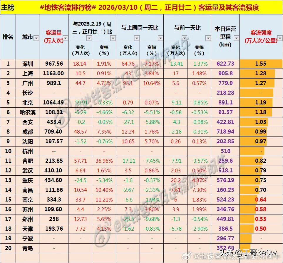 杭州周二地铁客流量超434万人次,客流量排在重庆、西安和武汉之前[呲牙][呲牙][呲牙] 爆料 身边事 排行榜 杭州 重庆 西安 武汉 周二 2026年3月10日 星期② 全国重点城市轨道交通客流量排行榜: 上海:1163.00万 北京:1064.49万 广州:989.10万 深圳:967.56万深圳地铁 成都:709.04万成都爆料 杭州:434万+ 重庆:434.60万重庆地铁 西安:433.40万西安身边事 武汉:410.10万武汉爆料 南京:334.30万 长沙:238万+长沙地铁 郑州:238.00万郑州地铁 合肥:213.85万 苏州:199.60万苏州爆料 沈阳:197.57万沈阳身边事 天津:193.76万天津d t 青岛:111万+ 宁波:111万+宁波身边事 南昌:111.86万南昌爆料 哈尔滨108.31万