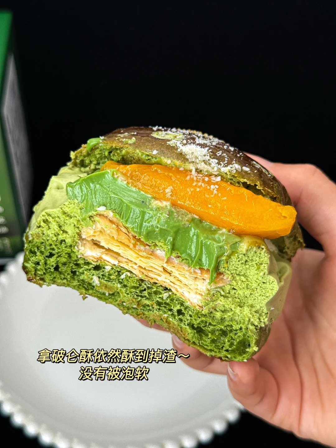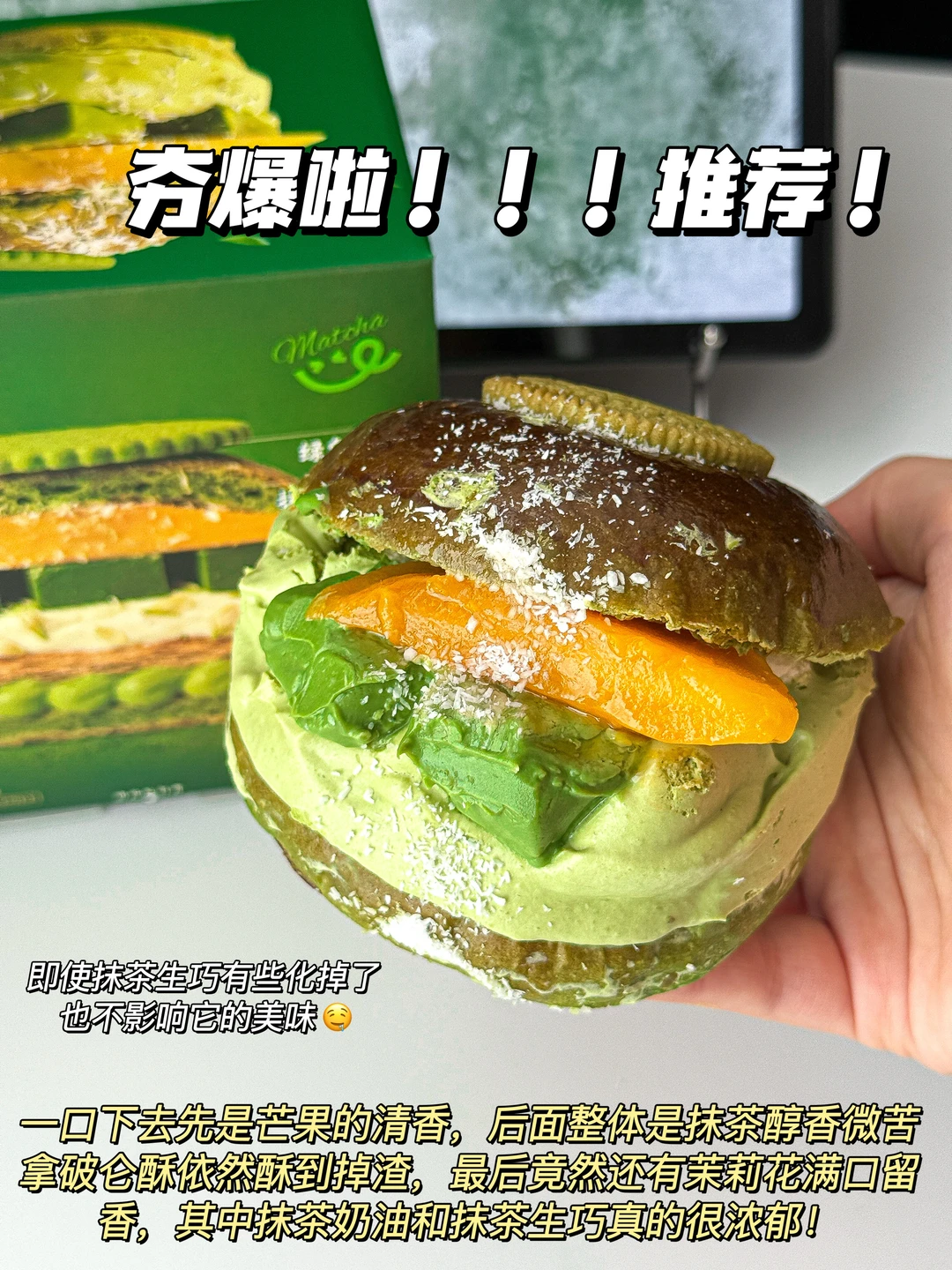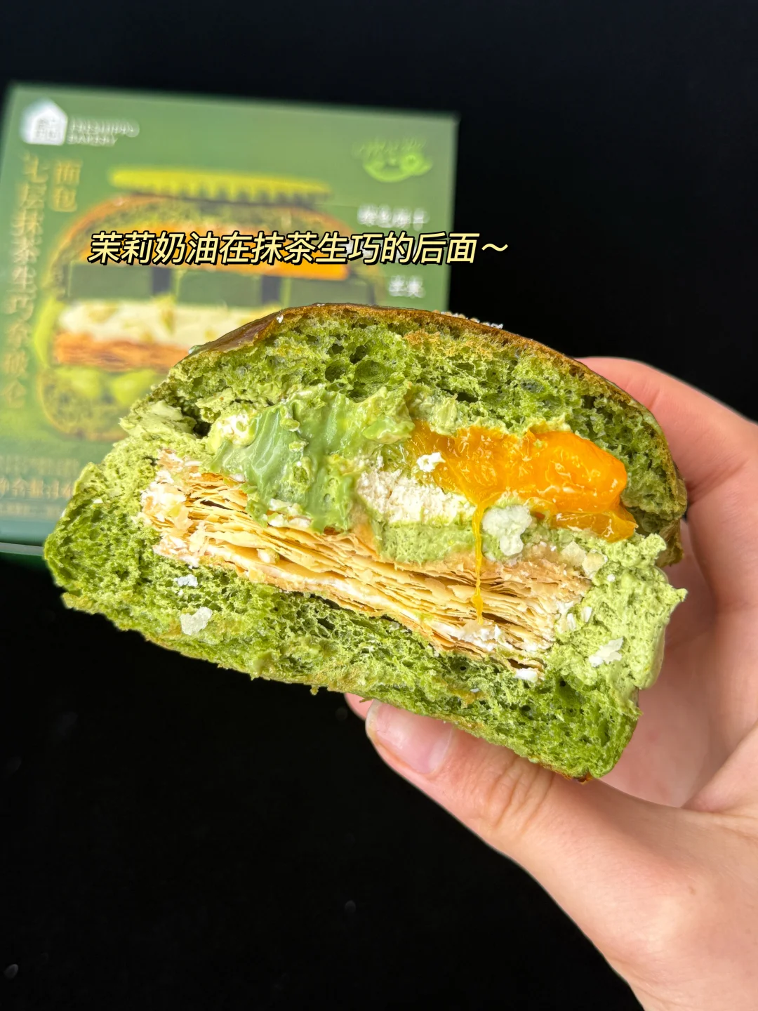 一口下去先是芒果🥭的清香,后面整体是抹茶醇香微苦,拿破仑酥依然酥到掉渣,最后竟然还有茉莉花满口留香,其中抹茶🍵奶油和抹茶生巧🍫真的很浓郁!!!芒果和茉莉香刚好中和抹茶的腻,口感层次好丰富!!!简直惊为天人,吃了8年抹茶季最好吃的一个品