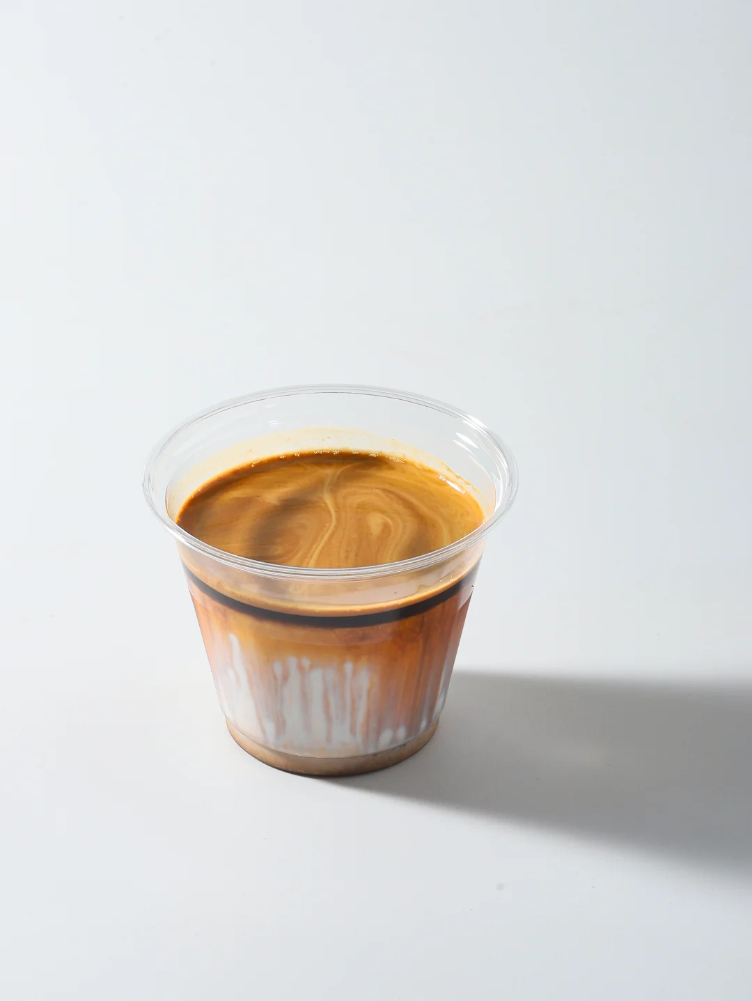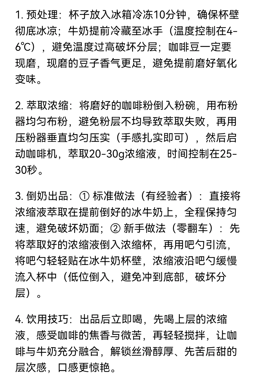3. 倒奶出品:① 标准做法(有经验者):直接将浓缩液萃取在提前倒好的冰牛奶上,全程保持匀速,避免破坏奶面;② 新手做法(零翻车):先将萃取好的浓缩液倒入浓缩杯,再用吧勺引流,将吧勺轻轻贴在冰牛奶杯壁,浓缩液沿吧勺缓慢流入杯中(低位倒入,避免冲到底部,破坏分层)。