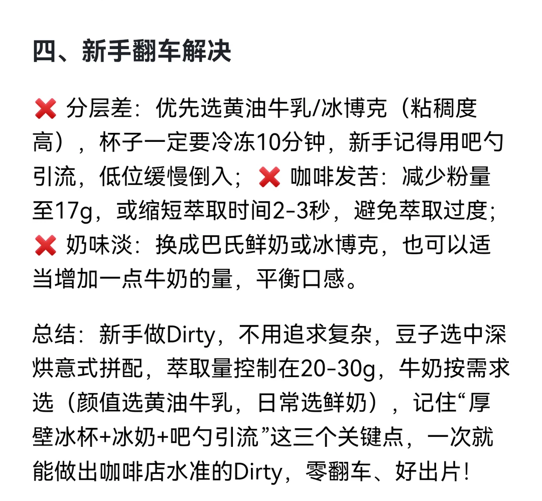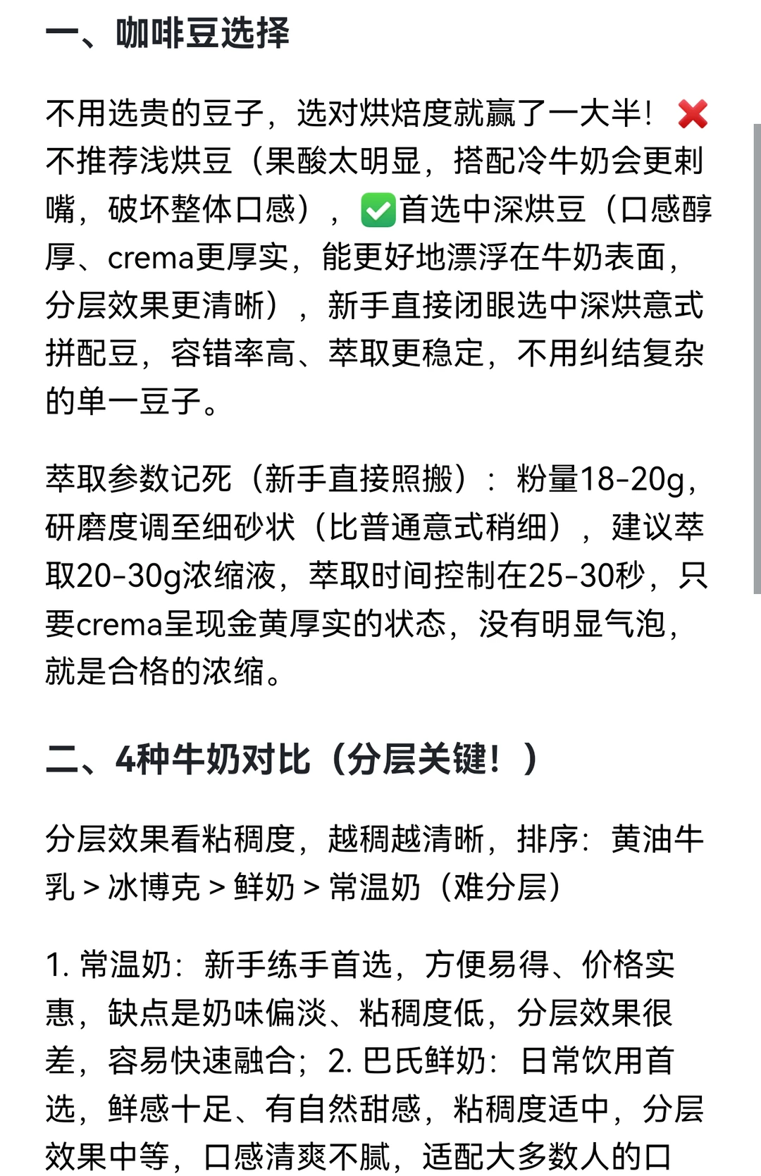 不用选贵的豆子,选对烘焙度就赢了一大半!❌不推荐浅烘豆(果酸太明显,搭配冷牛奶会更剌嘴,破坏整体口感),✅首选中深烘豆(口感醇厚、crema更厚实,能更好地漂浮在牛奶表面,分层效果更清晰),新手直接闭眼选中深烘意式拼配豆,容错率高、萃取更稳定,不用纠结复杂的单一豆子。