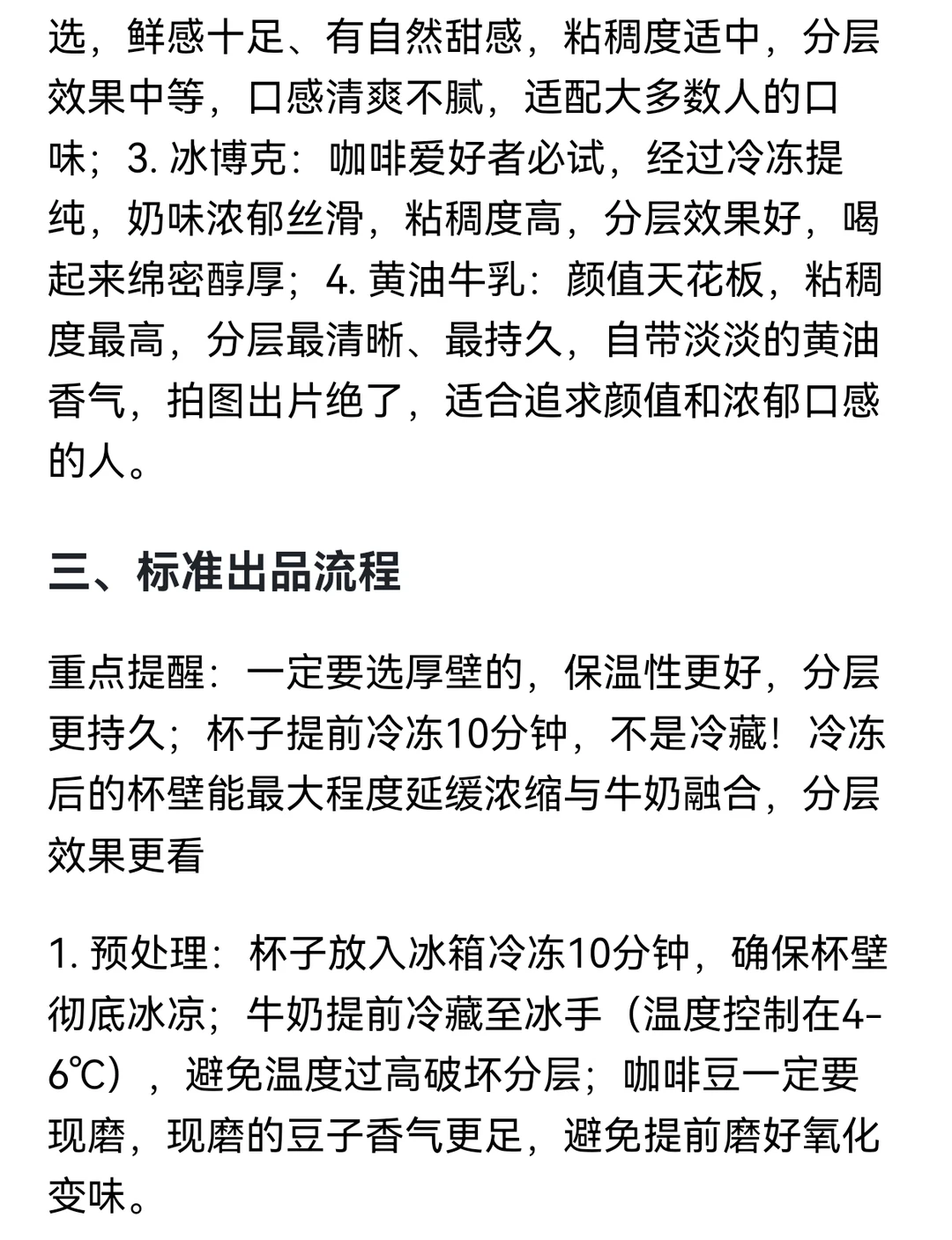 1. 常温奶:新手练手首选,方便易得、价格实惠,缺点是奶味偏淡、粘稠度低,分层效果很差,容易快速融合;2. 巴氏鲜奶:日常饮用首选,鲜感十足、有自然甜感,粘稠度适中,分层效果中等,口感清爽不腻,适配大多数人的口味;3. 冰博克:咖啡爱好者必试,经过冷冻提纯,奶味浓郁丝滑,粘稠度高,分层效果好,喝起来绵密醇厚;4. 黄油牛乳:颜值天花板,粘稠度最高,分层最清晰、最持久,自带淡淡的黄油香气,拍图出片绝了,适合追求颜值和浓郁口感的人。