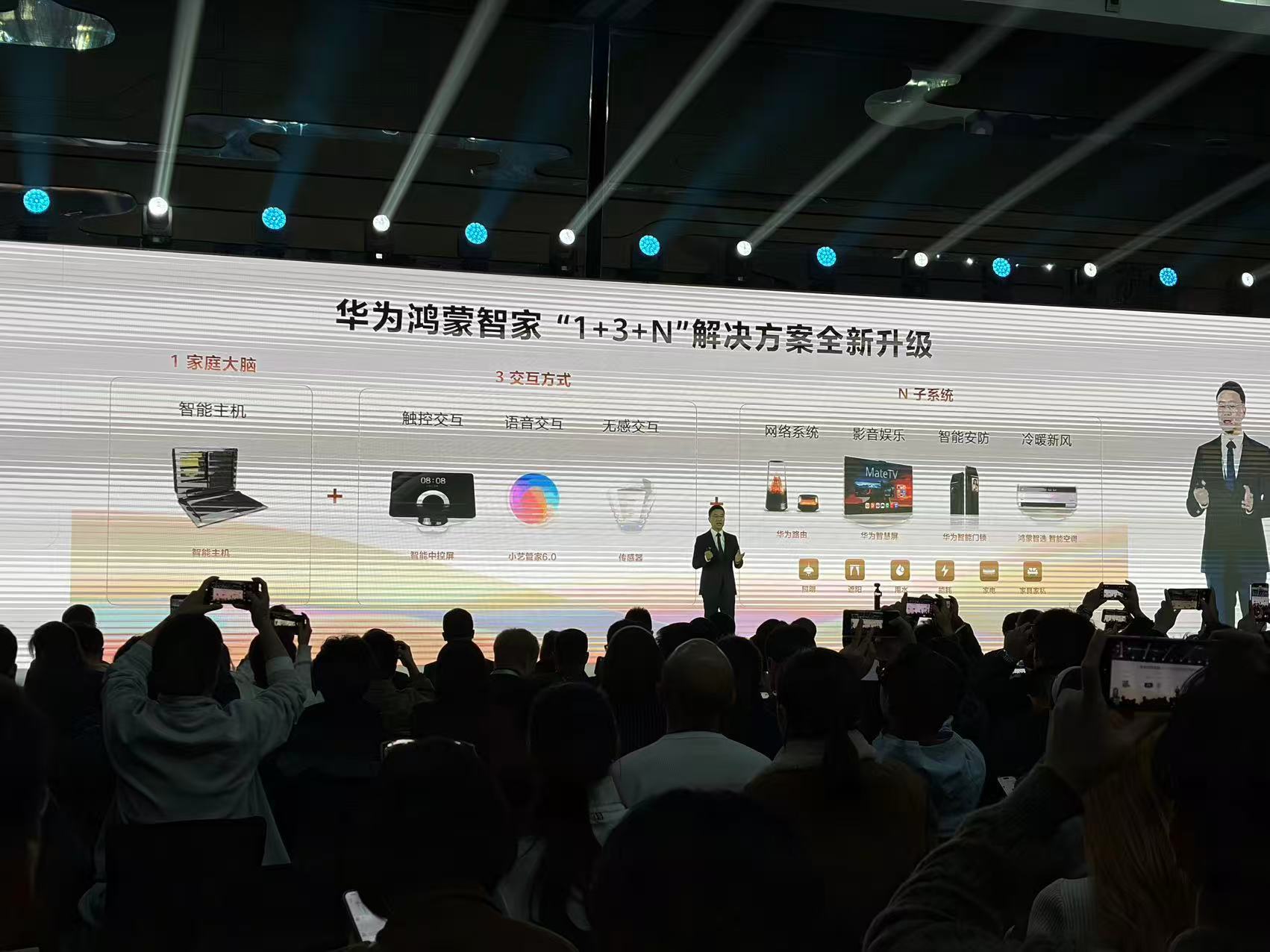 这次鸿蒙智家升级为 1+3+N解决方案:1 个智能主机作为家庭智慧大脑;3 种交互方式——触控、语音和无感交互;再通过 N 个子系统把照明、空气、影音等家庭场景全部连接起来。