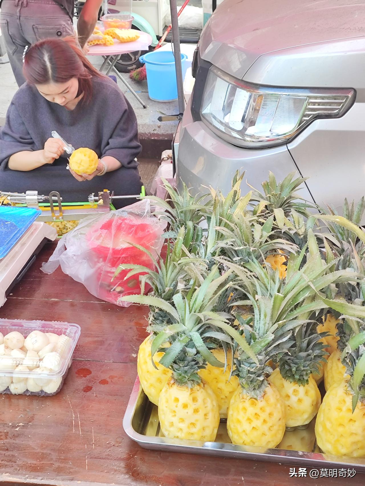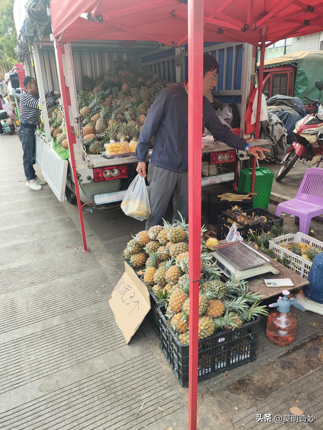 旅居云南弥勒日记:3月11日佛城商都前拖白路的水果大会情况。 今天温度预报为11-24摄氏度,微风,早晚凉快,中午微热,还是很舒服的。 2月底,这里突然开始有了菠萝,然后越来越多,成为拖白路上水果的主力,目前价格为10块钱2~3个,买过一个,味道一般,不是很甜,最近温度还不高,热量有限,糖化不足。 其他香蕉和芭蕉也略微多起来了,估计都跟温度渐渐升高有关。其他小的沙糖桔还是10元三公斤,少量的葡萄,品种都是很小的,桑葚也有了,很大,15元一公斤,枇杷也渐渐多起来了,20元一公斤,估计这些以后随着产量增多,价格都会下去。 蔬菜方面多起来的还有白萝卜,两今天是还价到两元一公斤,买了两个。 弥勒城市风光 弥勒烟火气 云南 弥勒