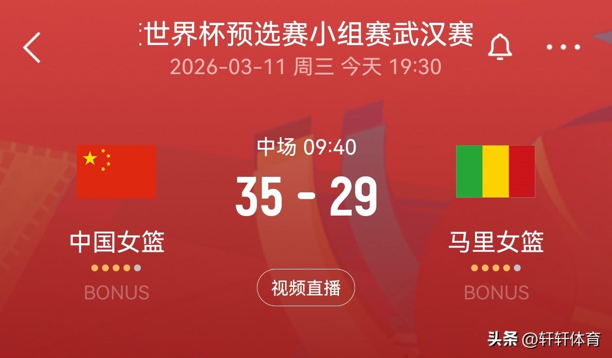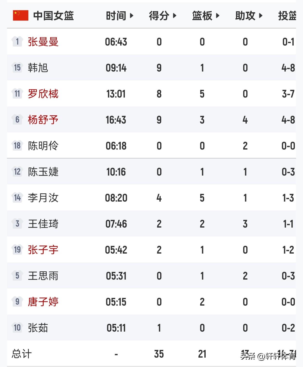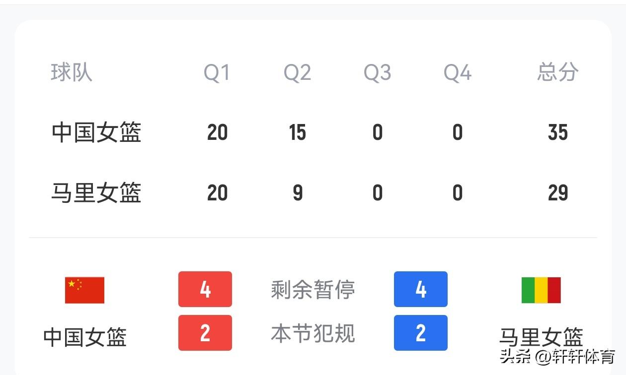 中国女篮世预赛首场对阵马里比赛,上半场已经结束半场比分中国女篮35-29领先马里女篮6分,半半场比分中国女篮韩旭、杨舒予各拿9分,罗欣棫8分,李月汝4分,张子宇,王佳琦各得2分,张茹1分,本场比赛中国女篮12人全部有出场,其中7人得分5人没有得分,张曼出场6分钟0分入账,陈明伶出场6分钟得到0分,陈玉婕出场10分钟得到0分,王思雨出场5分钟得到0分,唐子婷出场5分钟得到0分,相信看了半场比赛的球迷都有一种感觉,马里女篮实力不弱,反而我们女篮没有打出自己应有的水平,关键时刻篮下也没有占据多少优势,上半场马里女篮篮板球领先中国女篮5个,我们还拥有张子宇这个好大的内线。