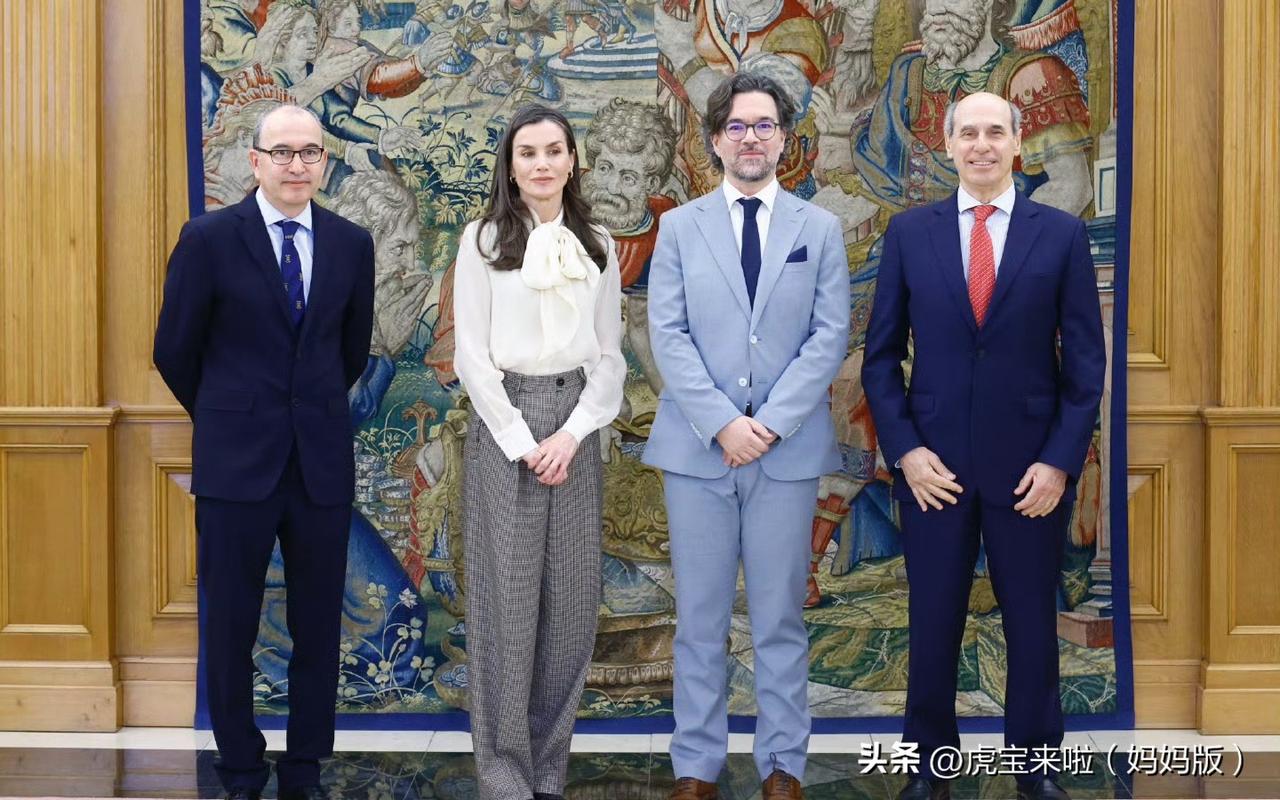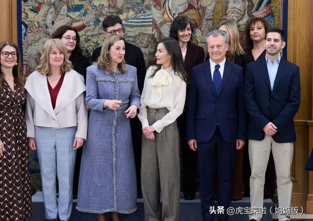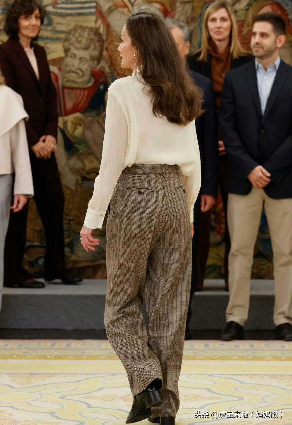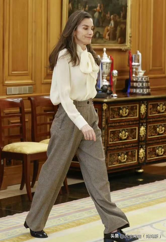 王后在王宫主持了三场接待会。白色蝴蝶结衬衫已经穿过很多次了。搭配宽松柔软的格纹长裤,很有上班赶场子的错觉!随着年龄的不断增长,王后的穿搭越发以舒适为主!